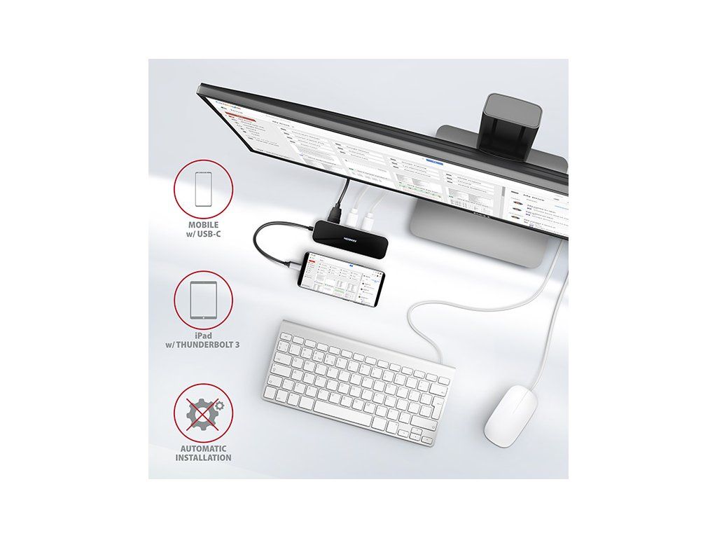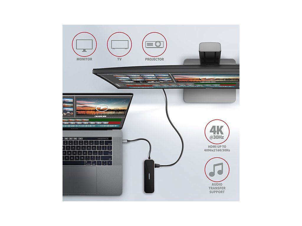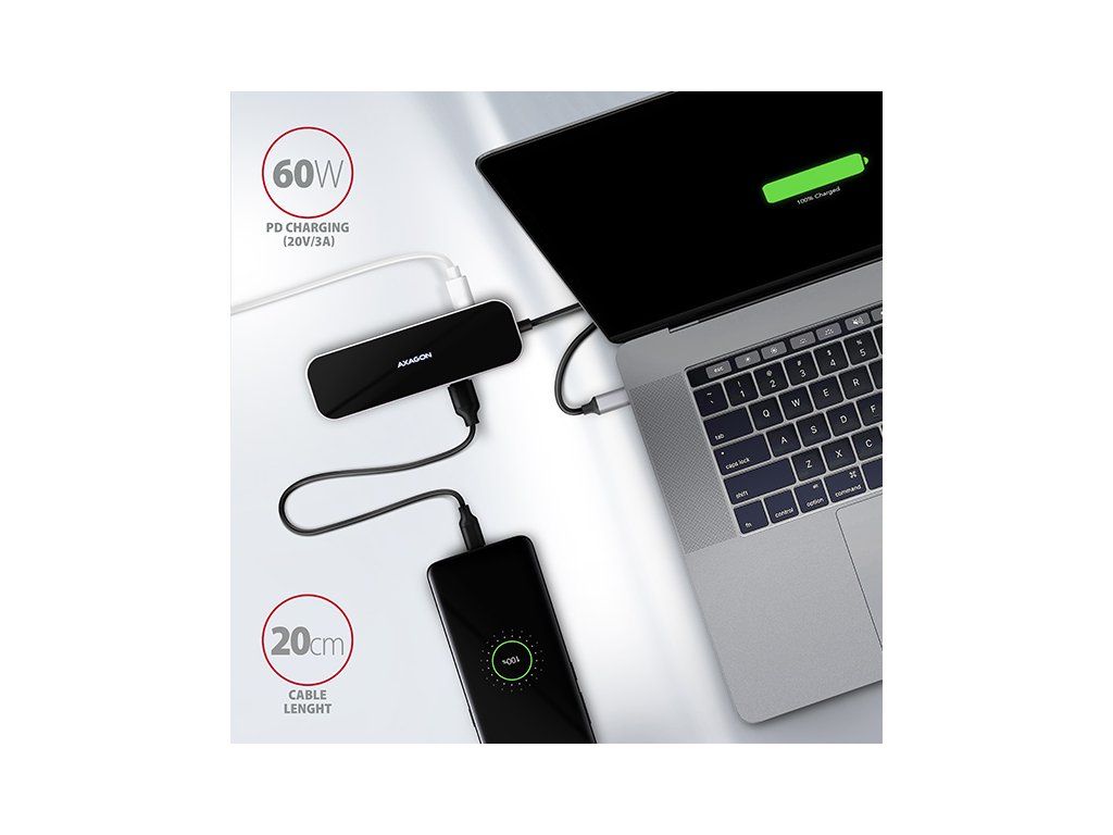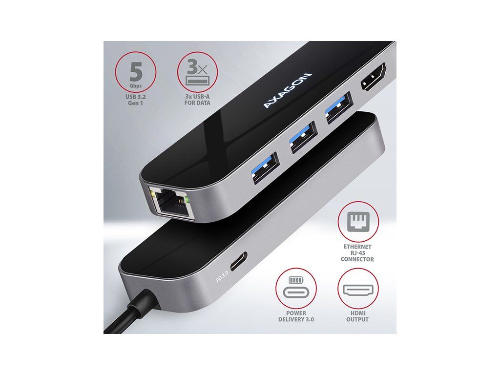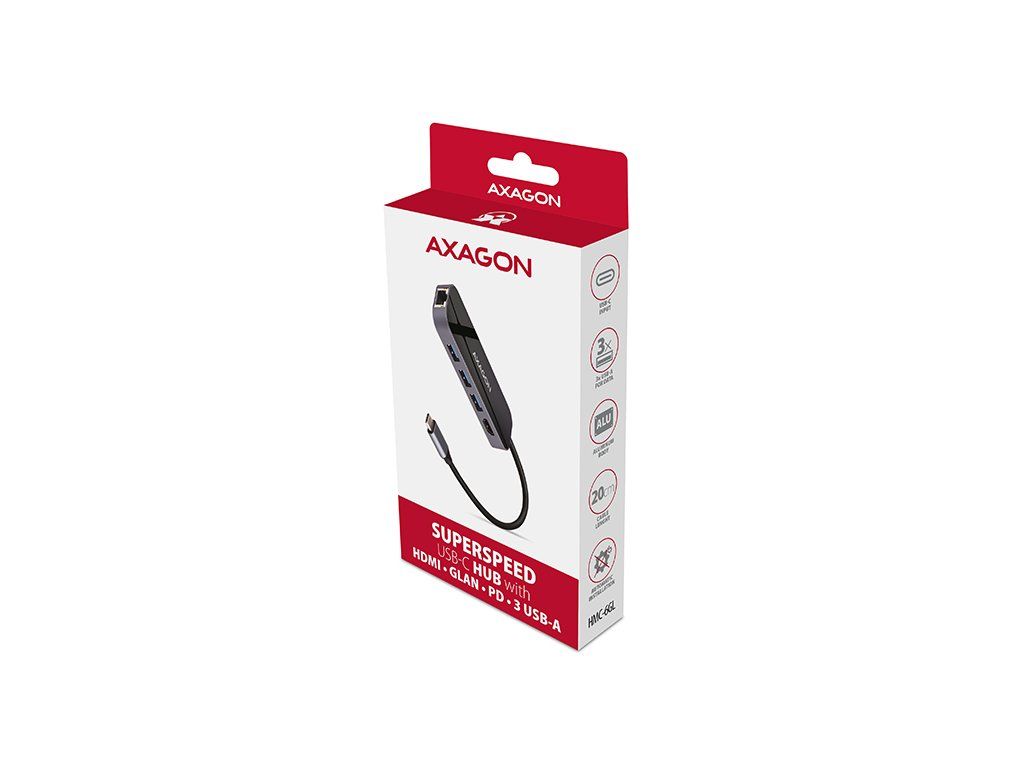 Multiportový USB-C 3.2 Gen 1 hub AXAGON HMC-6GL rozšíří Váš notebook, počítač nebo telefon o šest portů. Přes oboustranný USB-C konektor snadno a rychle připojíte k počítači až tři USB zařízení, Gigabitovou ethernet síť a HDMI zobrazovač současně. Zároveň získáte možnost napájení notebooku pomocí technologie Power Delivery. USB-C hub vám tak poskytne jednoduchou a skladnou dokovací stanici 6v1 k notebooku jako je například MacBook Pro. USB rozbočovač nabízí tři USB výstupy se standardními USB-A konektory. Hub zvládne trvalé připojení několika externích disků současně. Díky rychlému USB 3.2 Gen 1 rozhraní je přenosová rychlost hubu až 5Gb/s. Hub dále umožní nabíjení telefonů a tabletů proudem až 1,5A/5V, z hubu tak snadno nabijete např. Android smartphone, Apple iPhone, Apple iPad apod. USB-C konektor je vyhrazen pouze pro napájení a současné dobíjení telefonů nebo notebooků pomocí technologie Power Delivery 3.0 výkonem až 100W. Do hubu zapojíte USB-C Power Delivery nabíječku a hub připojíte k notebooku. Tím také uvolníte jeden USB-C port. Podmínkou je notebook s podporou nabíjení z USB-C portu pomocí Power Delivery a vhodná PD nabíječka. HDMI výstup poskytuje kvalitní obraz až do rozlišení 4K/30Hz Ultra HD a podporuje přenos vícekanálového zvuku. Podporována jsou také oblíbená hráčská rozlišení WQHD 2560 x 1440 při 60Hz nebo FullHD 1920 x 1080 při 60, 100 a 120Hz max. Pro správné fungování video výstupu je nutné, aby USB-C port notebooku podporoval DisplayPort Alternate Mode (DP Alt Mode) nebo Thunderbolt 3. Gigabitová síťová karta rozšíří počítač o rychlé a stabilní síťové připojení, doplní chybějící síťový RJ-45 Ethernet konektor, nebo přidá další síťovou kartu. LAN adapter je kompatibilní s rychlostmi 10/100/1000 Mbit/s a nabízí také širokou škálu funkcí např. IPv4/IPv6, crossover detekci a autokorekci, Wake-on-LAN, práce s VLAN nebo pokročilé funkce Power Managementu. Elegantní hliníkové tělo zajistí nejen mechanickou odolnost, ale i kvalitní chlazení. Horní lesklá část s decentně podsvíceným logem podtrhuje prémiový vzhled hubu. Replikátor portů je ideálním doplňkem pro notebooky bez USB-A konektorů, síťové karty a video výstupu. V hubu lze využít Vaše stávající USB periferie bez nutnosti pořizování nových. Díky funkcím Plug and Play a Hot Plug je samotné zapojení hubu velmi jednoduché bez složité instalace a také lze jednoduše připojovat a odpojovat periferie za běhu počítače. Rozbočovač se nezalekne ani připojení k telefonům s USB-C konektorem. K telefonu tak připojíte například flash disk, klávesnici, myš, monitor, TV nebo projektor. Vstup: • 1x USB 3.2 Gen 1 / SuperSpeed USB port, konektor USB-C male. • Zpětně kompatibilní s USB 3.1 Gen 1 / USB 3.0 a USB 2.0. • Kompatibilní s Thunderbolt 3. • Připojovací USB konektor typu C male (samec) umístěn na napevno uchyceném 20 cm kabelu. Výstupy USB: • 3x SuperSpeed USB port, konektor USB-A female. • 1x USB type C Power Delivery port (jen nabíjení), konektor USB-C female. • Podpora přenosových rychlostí 5.000 / 480 / 12 / 1.5 Mb/s (SuperSpeed / High / Full / Low speed). • Celková propustnost / přenosová rychlost je dána použitým USB 3.2 Gen 1 rozhraním (teoreticky až 5 Gbit/s). • USB-C hub zvládne připojení několika externích disků současně. • Nabíjení mobilních zařízení (včetně iPad) proudem až 1.5A v každém z USB portů hubu. Celkový nabíjecí proud (který se dělí na porty) dosahuje až 2.1A při napětí 5V (záleží na možnostech USB portu počítače). Výstup HDMI: • HDMI. • Konektor HDMI A (F) female. • Maximální podporované rozlišení 4K / 4096 x 2160 při 30 Hz. • WQHD rozlišení 2560 x 1440 při 60 Hz max. • FullHD rozlišení 1920 x 1080 při 60, 100, 120 Hz max. • Pro funkci video výstupu je nutné hub zapojit do USB-C portu s podporou DisplayPort Alternate Mode (DP Alt Mode) nebo do USB-C portu s podporou Thunderbolt 3. Zároveň je nutná podpora ze strany zařízení (notebooku, telefonu) a operačního systému. Bez této podpory nebude funkce video výstupu dostupná. • Podpora HPD (Hot-Plug-Detect). • Podpora TMDS (Transition Minimized Differential Signaling). • Plná podpora HDCP 1.4 a 2.3 (High-bandwidth Digital Content Protection). • Podpora až 8kanálového LPCM zvuku, komprimovaného audia (AC-3, DTS) a HBR audio formátů. • Podpora vzorkovací frekvence až 192 kHz a až 24bitového zvuku – závisí na zdrojovém a koncovém zařízení, tj. notebooku/telefonu a TV/monitoru/AV receiveru. Výstup RJ-45: • Rozhraní Gigabit Ethernet s RJ-45 konektorem pro připojení UTP nebo STP kabelem. • Podporované přenosové rychlosti Ethernet rozhraní 10/100/1000 Mb/s. • Podporované specifikace IEEE 802.3 10Base-T, IEEE 802.3u 100Base-TX, IEEE 802.3ab 1000Base-T. • 10/100/1000 Mb/s autodetekce. • Podpora IPv4/IPv6 packet Checksum Offload Engine (COE) pro snížení zatížení procesoru včetně IPv4 IP/TCP/UDP/ICMP/IGMP & IPv6 TCP/UDP/ICMPv6 kontroly a generování kontrolního součtu. • Podpora TCP Large Send Offload V1 a V2. • Podpora IEEE 802.1P Layer 2 priority encoding & decoding. • Podpora IEEE 802.1Q VLAN tagging. • Podpora IEEE 802.3az EEE (Energy Efficient Ethernet) - snížení spotřeby v klidovém stavu. • Podpora Jumbo frame. • Podpora full-duplex přenosů s IEEE 802.3x flow control i half-duplex přenosů s back-pressure flow control. • Podpora Auto MDI/MDIX - crossover detekce a autokorekce eliminuje potřebu crossover kabelů. • Podpora hardwarového Cyclic Redundancy Check (CRC) pro odhalení chyb přenosu. • Podpora pair swap/polarity/skew korekce. • Funkce Wake-on-LAN v různých módech: Podpora režimu spánku a vzdáleného probuzení pomocí Mag