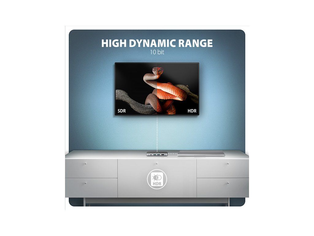 Multiportový USB-C 5Gbps AXAGON HMC-6GLN GLASS 6in1 hub rozšíří váš notebook, počítač nebo telefon o šest portů. Váš notebook připojíte k hubu přes 20 cm dlouhý USB-C kabel. Okamžitě tak máte k dispozici připojení pro monitor, tři USB zařízení a konektor RJ-45 pro Gigabitovou ethernet síť. Zároveň získáte možnost napájení notebooku pomocí technologie Power Delivery. Replikátor portů vám poskytne jednoduchou a skladnou dokovací stanici 6v1 pro moderní notebooky. USB rozbočovač nabízí tři USB 5Gbps výstupy, dva se standardním USB-A a třetí s USB-C datovým konektorem. Díky USB 3.2 Gen 1 rozhraní je přenosová rychlost hubu až 5Gb/s. Hub zvládne trvalé připojení několika externích disků současně a také dovolí nabíjení telefonů a tabletů proudem až 1.5A/5V. Z hubu tak snadno nabijete např. Android smartphone, Apple iPhone, Apple iPad apod. Další z USB-C konektorů je vyhrazen pouze pro nabíjení telefonů nebo notebooků pomocí technologie Power Delivery 3.0 výkonem až 100W. Do hubu zapojíte vhodnou USB-C Power Delivery nabíječku a hub připojíte k notebooku s podporou Power Delivery. Tím také uvolníte jeden USB-C port. HDMI výstup umožňuje připojení externího monitoru, TV nebo projektoru s rozlišením až 4K/60Hz Ultra HD, 2K/144Hz Quad HD nebo 1080p/240Hz Full HD a přenos vícekanálového zvuku. Díky podpoře HDR si můžete vychutnat výrazně rozšířený rozsah barev a kontrastů. Gigabitová síťová karta rozšíří počítač o rychlé a stabilní síťové připojení, doplní chybějící síťový RJ-45 Ethernet konektor, nebo přidá další síťovou kartu. Kompaktní hliníkové tělo nejen skvěle vypadá, ale zajistí i mechanickou odolnost a pasivní chlazení. Horní lesklá část s decentně podsvíceným logem podtrhuje prémiový vzhled hubu. USB-C hub je ideálním doplňkem pro notebooky bez USB-A konektorů a video výstupu. Lze tak využít Vaše stávající USB periferie bez nutnosti pořizování nových. Díky funkcím Plug and Play a Hot Plug je samotné zapojení hubu velmi jednoduché bez složité instalace, a také lze jednoduše připojovat a odpojovat periferie za běhu počítače. Pro správnou funkci hubu je nutné, aby USB-C port vašeho notebooku podporoval video výstup (DisplayPort Alternate Mode nebo Thunderbolt 3, 4 a vyšší) a Power Delivery napájení. Rozbočovač bez problému zvládne připojení k telefonům s USB-C konektorem. K telefonu tak můžete připojit například flash disk, klávesnici, myš, monitor, televizi nebo projektor. Vstup (připojení k počítači, tabletu nebo telefonu): • USB 5Gbps (USB 3.2 Gen 1 / USB 3.0), konektor USB-C male. • Kompatibilní s USB 10Gbps, USB4, Thunderbolt 3/4. Vstup (napájení): • USB Power Delivery 3.0 - 100W port, konektor USB-C female. • Napájení notebooku ze síťového adaptéru přes USB-C hub. • Napájení PD musí podporovat jak notebook (tablet, telefon), tak síťová nabíječka. Výstupy USB: • 2x USB 5Gbps port, konektor USB-A female. • 1x USB 5Gbps port, konektor USB-C female. • USB-C hub zvládne připojení několika externích disků současně. • Nabíjení mobilních zařízení (včetně iPad) proudem až 1.5A/5V z USB-A a USB-C portů hubu. Výstup video: • 1x HDMI port, konektor HDMI A female. Maximální podporované rozlišení: • 1 monitor - až 4K/60Hz Ultra HD, 2K/144Hz Quad HD, 1080p/240Hz Full HD. Vlastnosti videa: • U zařízení Apple s macOS je maximální obnovovací frekvence většinou omezena na 60Hz. • Pro dosažení maximálních hodnot rozlišení a frekvencí na video výstupech je nutné hub zapojit do USB-C portu s podporou DisplayPort Alternate Mode (DP Alt Mode) verze min. 1.4 nebo do USB-C portu s podporou min. Thunderbolt 3. Dále je nutný vhodný aktualizovaný OS a aktuální grafické ovladače. • Podpora HDR (High Dynamic Range, 10 bit support) - realistická reprodukce světlých a tmavých detailů. • Podpora HPD (Hot-Plug-Detect). • Podpora TMDS (Transition Minimized Differential Signaling). • Plná podpora HDCP 1.4 a 2.2 (High-bandwidth Digital Content Protection). • Podpora 2kanálového LPCM zvuku, komprimovaného audia (AC-3, DTS) a HBR audio formátů. • Podpora vzorkovací frekvence až 192 kHz a až 24bitového zvuku – závisí na zdrojovém a koncovém zařízení, tj. notebooku/telefonu a TV/monitoru/AV receiveru. Výstup RJ-45: • Rozhraní Gigabit Ethernet s RJ-45 konektorem pro připojení UTP nebo STP kabelem. • Podporované přenosové rychlosti Ethernet rozhraní 10/100/1000 Mb/s. • Podporované specifikace IEEE 802.3i 10Base-T, IEEE 802.3u 100Base-TX, IEEE 802.3ab 1000Base-T. • 10/100/1000 Mb/s autodetekce. Další vlastnosti: • Možnost připojení zařízení za chodu díky podpoře Hot Plug. • Plná podpora Plug and Play. • Podpora úsporného režimu. • Napájení prostřednictvím USB sběrnice - USB bus power. • Napájení přes PD nabíječku (není součástí balení). • Kvalitní stíněný kabel zaručuje vysokou rychlost komunikace a minimální nežádoucí interference. • Rozměry 13 x 110 x 35 mm (V x Š x H). • Hmotnost 58 g (vč. kabelu). • USB-C kabel délky 20 cm pro připojení hubu k notebooku. Podporované operační systémy: • Windows 10 / 11, macOS, iPadOS, iOS, Linux, Chrome OS a Android. • Kompatibilita je závislá na používaném operačním systému a podpoře od výrobce zařízení. • DisplayPort Alternate Mode (DP Alt Mode) je podporovaný pouze v aktualizovaných operačních systémech a dále závisí na podpoře ze strany zařízení (notebooku, tabletu, telefonu). • Na správnou funkci produktu mohou mít také vliv ovladače grafické karty. Doporučujeme stáhnout nejnovější verzi ovladačů. Balení v kartonové krabičce s otvorem pro zavěšení obsahuje: • USB-C hub s kabelem napevno délky 20 cm, • víc