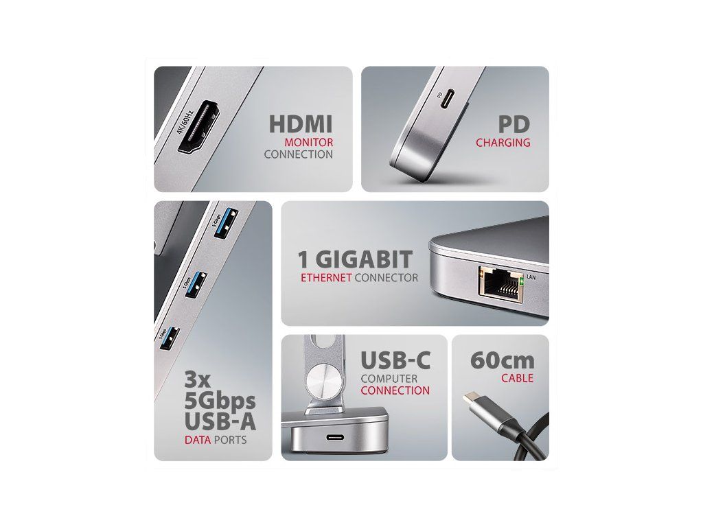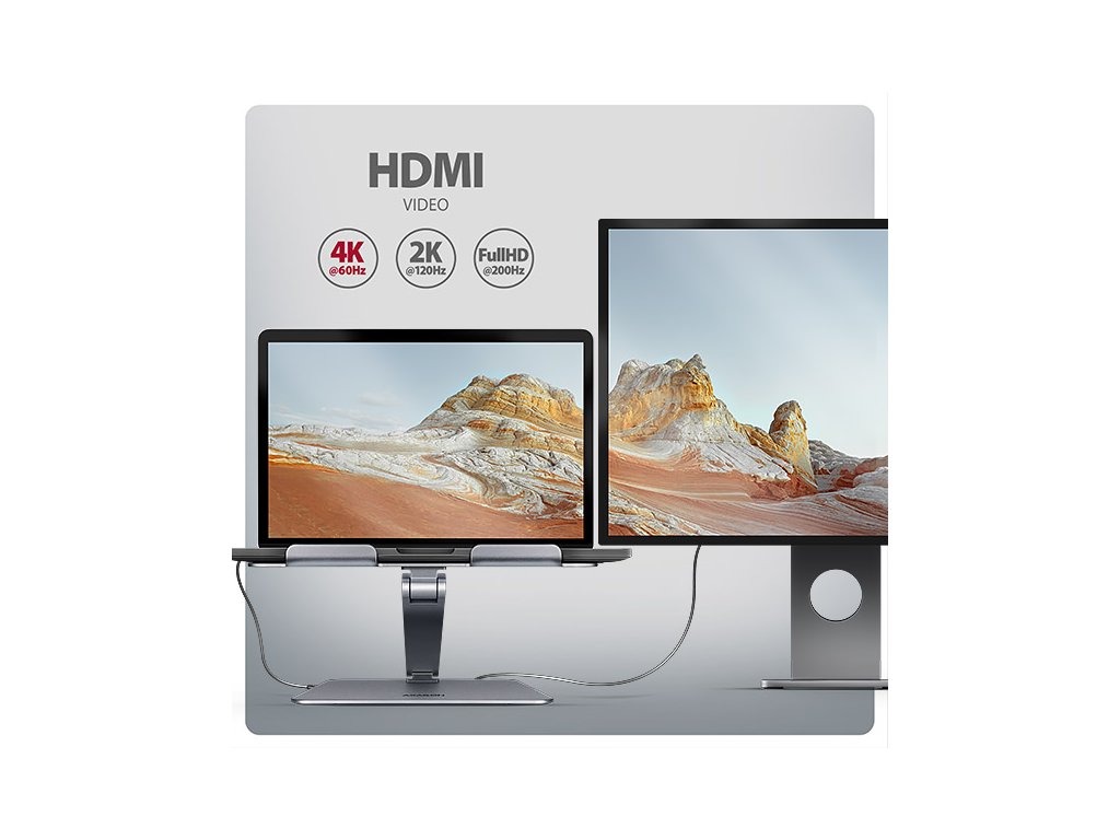 AXAGON HMC-STND 7in1 Hub & Stand je jedinečný multifunkční hub integrovaný do stojanu na notebook nebo tablet. Tento hub rozšíří Váš notebook nebo tablet o dalších šest portů. Váš notebook připojíte k hubu přes USB-C <-> USB-C kabel dlouhý 60 cm. Okamžitě tak máte k dispozici připojení pro monitor, tři USB zařízení, konektor RJ-45 pro Gigabitovou ethernet síť a napájení notebooku pomocí technologie Power Delivery. Stojan s dvěma klouby zlepšuje ergonomii a pohodlí při práci a je vhodný pro zařízení od 10'' do 17.3''. Je ideální jako dokovací stanice 7v1 pro Windows notebooky i Apple MacBook Air nebo MacBook Pro. Tři USB-A 5Gbps výstupy umožňují připojení externích disků (až 2 současně), flash disku, myši, tiskárny a dalšího USB příslušenství. USB porty také nabíjí mobilní telefony a tablety výkonem až 7.5W. Gigabitová síťová karta rozšíří počítač o rychlé a stabilní síťové připojení, doplní chybějící síťový RJ-45 Ethernet konektor, nebo přidá další síťovou kartu. HDMI výstup umožňuje připojení externího monitoru, TV nebo projektoru s rozlišením až 4K/60Hz Ultra HD, 2K/120Hz Quad HD nebo 1080p/200Hz Full HD a přenos vícekanálového zvuku. Díky podpoře HDR si můžete vychutnat výrazně rozšířený rozsah barev a kontrastů bez omezení. PD USB-C vstup je určen pro vhodnou Power Delivery nabíječku. Díky tomu je vaše mobilní zařízení i hub napájen přímo z PD nabíječky s využitím technologie Power Delivery 3.0 s výkonem až do 100W. Druhý USB-C konektor slouží k propojení s notebookem pomocí přiloženého 60 cm dlouhého kabelu s oboustranným USB-C konektorem na obou koncích. Díky funkcím Plug and Play a Hot Plug je samotné zapojení hubu velmi jednoduché bez složité instalace, a také lze jednoduše připojovat a odpojovat periferie za běhu počítače. Velkou výhodou je chytré řešení s dvojitým kloubem, které umožňuje plynulé nastavení výšky obrazovky notebooku tak, aby byl v jedné rovině s vaším externím monitorem. Tím získáte další pracovní plochu ve správné úrovni očí, což výrazně zlepšuje ergonomii a pohodlí při práci, a zároveň zvyšuje vaši produktivitu. Elegantní design v šedé barvě nejen stylově doplní váš pracovní stůl, ale také přináší praktické funkce, které oceníte při každodenním používání. Podstavec i kryt hubu jsou vyrobeny z robustních hliníkových odlitků, které zajišťují pasivní chlazení a garantují dlouhou životnost a spolehlivost stojanu i hubu. Výřezy v podstavci zajišťují optimální odvod tepla z vašeho notebooku, čímž zvyšují jeho výkon a životnost. Díky protiskluzové úpravě zůstane vaše zařízení bezpečně na svém místě bez rizika nechtěných pohybů, a to bez jakéhokoliv poškození povrchu notebooku nebo podložky. Vstup (připojení k počítači nebo tabletu): • USB 5Gbps (USB 3.2 Gen 1 / USB 3.0), konektor USB-C female. • Kompatibilní s USB 10Gbps, USB4, Thunderbolt 3/4/5. Vstup (napájení): • USB Power Delivery 3.0 - 100W port, konektor USB-C female. • Napájení mobilního zařízení ze síťového adaptéru přes USB-C hub. • Napájení PD musí podporovat jak mobilní zařízení, tak síťová nabíječka. Výstupy USB: • 3x USB 5Gbps port, konektor USB-A female. • USB-C hub zvládne připojení několika externích disků současně. • Nabíjení mobilních zařízení (včetně iPad) proudem až 1.5A/5V z USB-A a USB-C PD. Výstupy video: • 1x HDMI port, konektor HDMI A female. Maximální podporované rozlišení: • 1 monitor - až 4K/60Hz Ultra HD, 2K/120Hz Quad HD, 1080p/200Hz Full HD Vlastnosti videa: • U zařízení Apple s macOS je maximální obnovovací frekvence většinou omezena na 60Hz. • Pro dosažení maximálních hodnot rozlišení a frekvencí na video výstupech je nutné hub zapojit do USB-C portu s podporou DisplayPort Alternate Mode (DP Alt Mode) verze min. 1.4 nebo do USB-C portu s podporou min. Thunderbolt 3. Dále je nutný vhodný aktualizovaný OS a aktuální grafické ovladače. • Podpora HDR (High Dynamic Range, 10 bit support) - realistická reprodukce světlých a tmavých detailů. • Podpora HPD (Hot-Plug-Detect). • Podpora TMDS (Transition Minimized Differential Signaling). • Plná podpora HDCP 1.4 a 2.3 (High-bandwidth Digital Content Protection). • Podpora 8kanálového LPCM zvuku, komprimovaného audia (AC-3, DTS) a HBR audio formátů. • Podpora vzorkovací frekvence až 192 kHz a až 24bitového zvuku – závisí na zdrojovém a koncovém zařízení, tj. notebooku/telefonu a TV/monitoru/AV receiveru. Výstup RJ-45: • Rozhraní Gigabit Ethernet s RJ-45 konektorem pro připojení UTP nebo STP kabelem. • Podporované přenosové rychlosti Ethernet rozhraní 10/100/1000 Mb/s. • Podporované specifikace IEEE 802.3i 10Base-T, IEEE 802.3u 100Base-TX, IEEE 802.3ab 1000Base-T. • 10/100/1000 Mb/s autodetekce. Vlastnosti stojanu: • Lehká a pevná kovová konstrukce. • Protiskluzová úprava, která zároveň chrání zařízení od poškrábání. • Vhodný pro 10''–17.3'' notebooky, nebo jiná zařízení. • Nastavitelná výška až 215 mm. • Mnoho nastavitelných poloh. • Nastavení sklonu plochy pro notebook (0–180°). • Nastavení sklonu ramene (0–180°). • Nosnost dimenzována pro všechny typy notebooků, max. 5 kg. • Skladný a lehce složitelný. • Držák notebooku umožňuje lepší odvod tepla. Další vlastnosti: • Možnost připojení zařízení za chodu díky podpoře Hot Plug. • Plná podpora Plug and Play. • Podpora úsporného režimu. • Napájení prostřednictvím USB sběrnice - USB bus power. • Napájení přes PD nabíječku (není součástí balení). • Kvalitní stíněný kabel zaručuje vysokou rychlost komunikace a minimální nežádoucí interference. • Roz