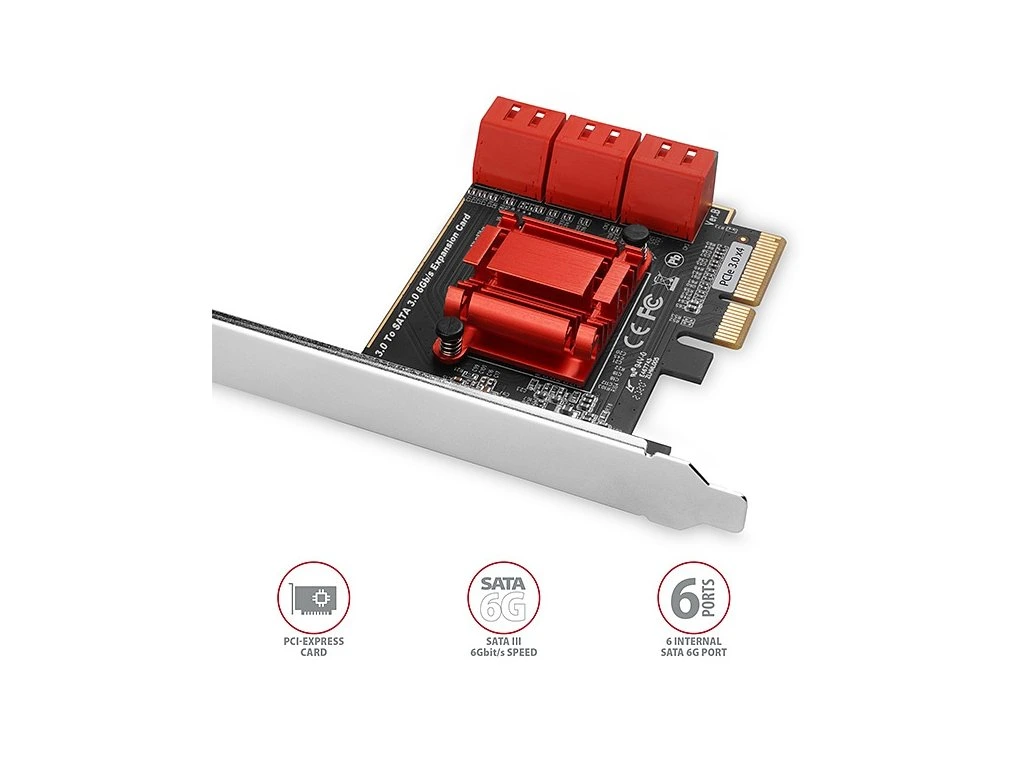 PCI-Express řadič AXAGON PCES-SA6 rozšíří stolní PC o šest vysokorychlostních SATA III portů s přenosovou rychlostí až 6Gb/s. Karta osazená čipsetem ASMedia nabízí nejen podporu specifikace SATA 3.0, ale i dalších SATA technologií jako Hot-Plug, Native Command Queue (NCQ), TRIM nebo Port Multiplier. Jednoduchá instalace bez nutnosti instalace ovladačů ve většině operačních systémů. Díky přibalené low profile záslepce lze řadič osadit jak do standardní, tak i do nízkoprofilové PC skříně. Vstup: • Rozhraní PCI-Express 3.0, kompatibilní s PCI-Express 1.0a / 1.1 / 2.0 / 2.1. • Počet linek 2-Lane (x2), kompatibilní s x4 / x8 / x16 PCIe sloty. • Propustnost 2-Lane PCI-Express 3.0 sběrnice 2 GB/s. Výstup: • 6x nezávislý Serial ATA port, standard SATA III 6G. • 6x interní 7-pin SATA datový konektor. • Podpora všech SATA I / SATA II / SATA III optických mechanik, SSD a pevných disků všech kapacit. Další vlastnosti: • Plná podpora Plug and Play. • Vyhovuje Serial ATA 3.0 specifikaci (SATA/600), přenosové rychlosti až 6 Gb/s (600 MB/s). • Vyhovuje Serial ATA 2.0 specifikaci (SATA/300), přenosové rychlosti až 3 Gb/s (300 MB/s). • Vyhovuje Serial ATA 1.0 specifikaci (SATA/150), přenosové rychlosti až 1.5 Gb/s (150 MB/s). • Vyhovuje Serial ATA AHCI (Advanced Host Controller Interface) specifikaci revize 1.4. • Podpora Hot Plug umožňující připojení a odpojení SATA zařízení za chodu. • Podpora Native Command Queuing (NCQ). • Podpora funkce TRIM pro SSD disky. • Podpora funkce Port Multiplier Command Based Switching. • Použit čipset ASMedia ASM1166. Podporované operační systémy: • MS Windows 7 / 8 / 8.1 / 10 / 11 a novější, Windows Server 2008 / 2012 / 2016 / 2019 / 2022 a novější (podporovány všechny 32- i 64-bitové verze OS Windows), Linux s jádrem 2.6.x a vyšším. Balení v kartónové krabičce obsahuje: • PCI-Express SATA řadič, • low profile záslepku, • multijazyčný manuál CZ/DE/DK/ENG/ESP/FIN/FR/GR/HR/HU/IT/NL/PL/PT/RO/RU/SK/SWE/TR/BG/CN/ARA.Dodatočné parametre