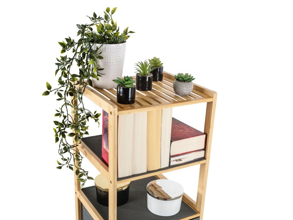 Bambusový regál s výsuvnými látkovými zásuvkami dodáva interiéru príjemný prírodný dojem, pocit ľahkosti a prirodzenosti, zatiaľ čo jeho pevnosť a dlhá životnosť zaisťujú stabilitu a trvanlivosť.