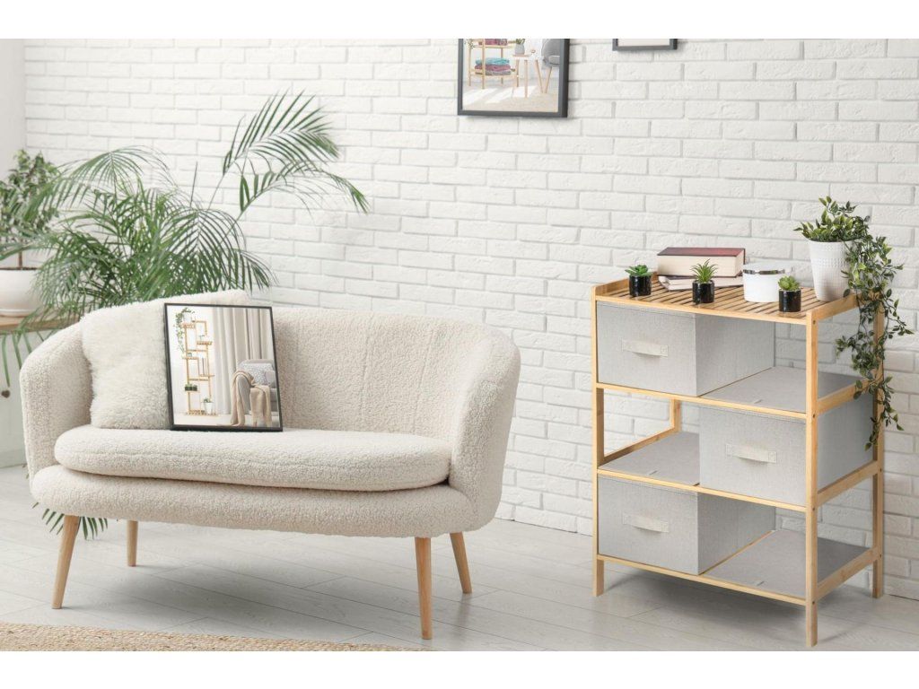 - Určenie: bambusový regál s textilnými košíkmi