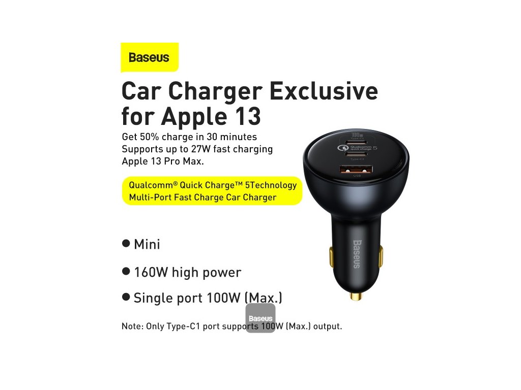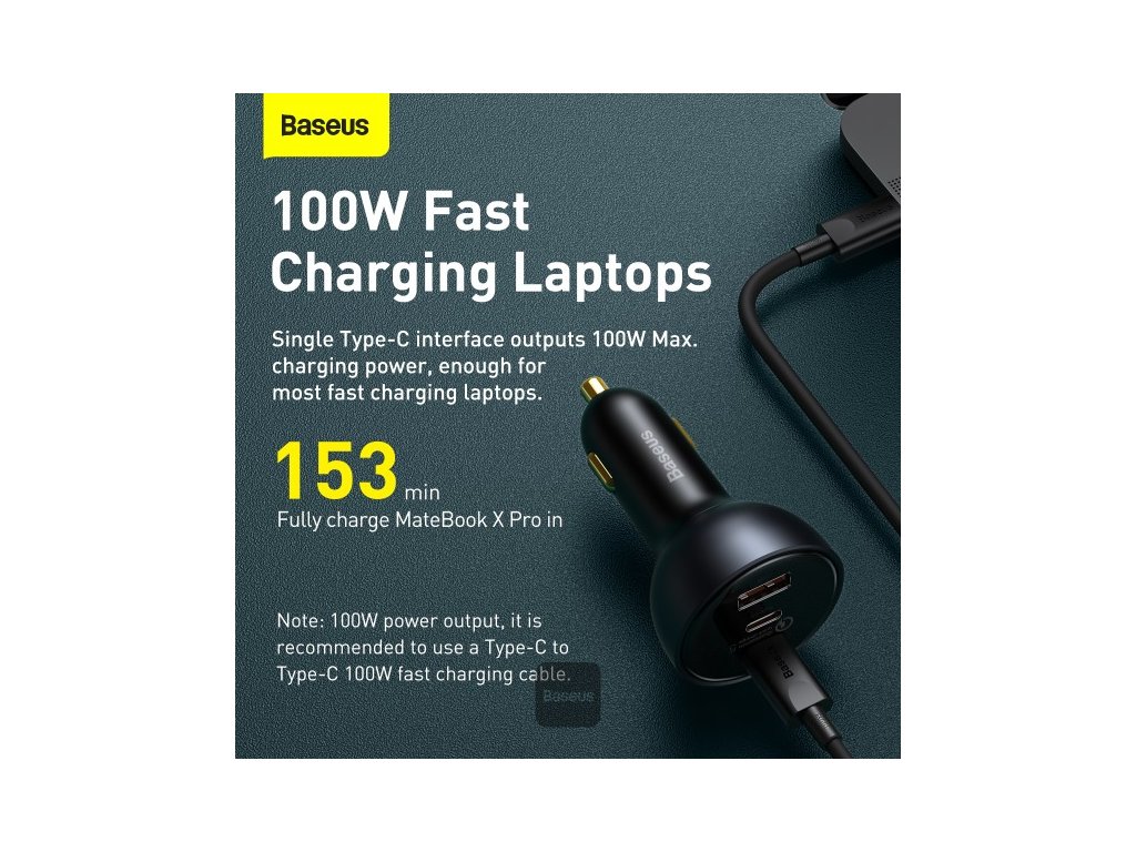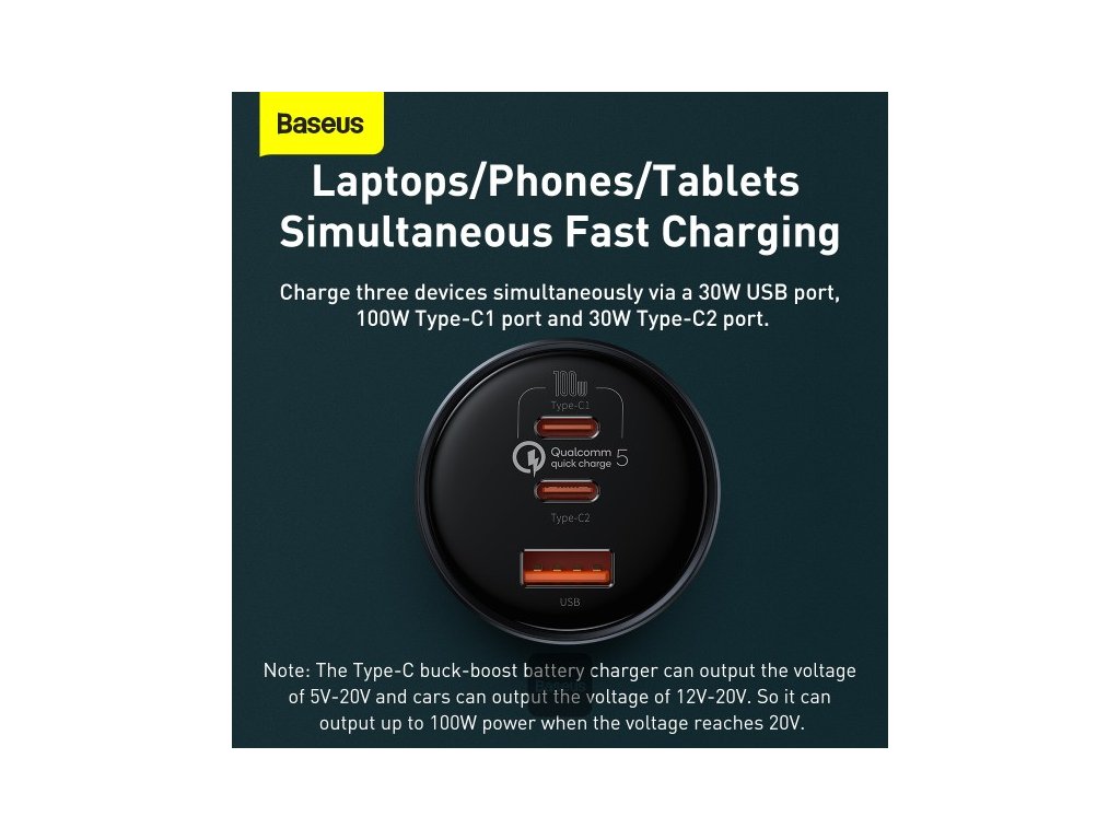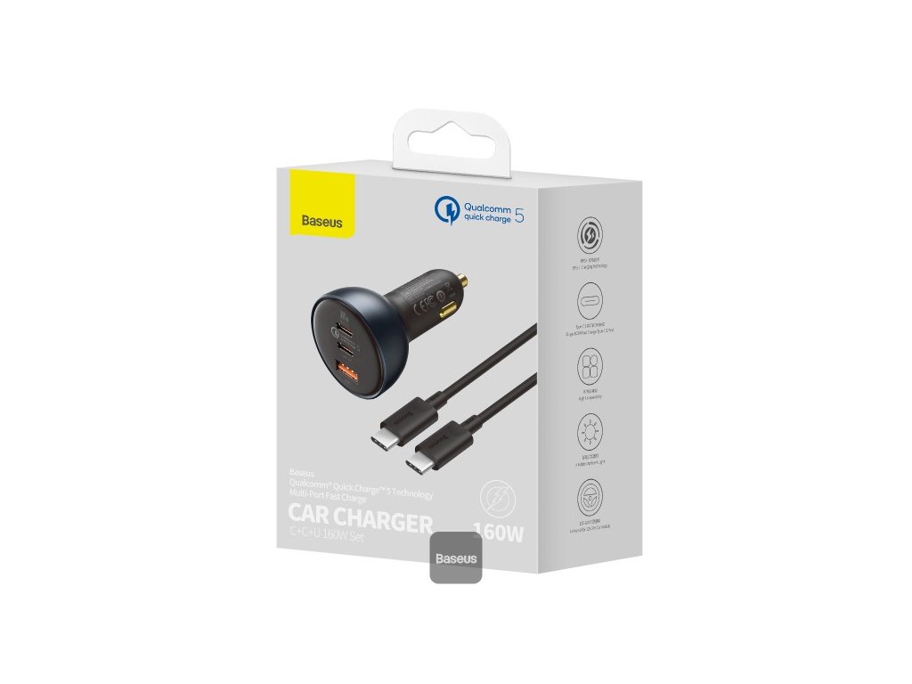Baseus 160W nabíječka do auta Quick Charge QC 5.0 4.0 3.0 PD Nabíječka pro Macbook iPad Pro Laptop USB Typ C nabíječka pro iPhone Xiaomi * Nabíjejte jakékoli zařízení na cestách pomocí autonabíječky Baseus Qualcomm QC5.0. * Tento model je vybaven třemi porty pro rychlé nabíjení s kombinovaným výkonem 160 W, díky čemuž je vhodný pro nabíjení vašeho notebooku, ale i smartphonu, tabletu a dalších zařízení a gadgetů. * Kompaktní design s ozdobným prstencovým světlem pak doplní každý interiér a zabere minimum místa. Vlastnosti * Univerzální nabíječka do auta od Baseus * Jeden typ A a dva nabíjecí porty typu C. * Podporuje nabíjecí protokol Qualcomm QC5.0. * Kompatibilní se staršími protokoly * Vhodné pro použití ve vozidlech 12V a 24V * Součástí je 1 m dlouhý nabíjecí kabel. Specifikace * Vstup: 12-24V * Celkový výkon: 160W * Výstup USB-C 1: 5V/3A, 9V/3A, 12V/3A, 15V/3A, 20V/5A (100W) * Výstup USB-C 2: 5V/3A, 9V/2,22A, 12V/2,5A, 15V/2A, 20V/1,5A (30W) * Výstup USB-A: 5V/3A, 9V/2A, 10V/2A, 12V/2,5A (30W) * Rozměry: 43x43x77 mm * Hmotnost: 45gDodatočné parametre
