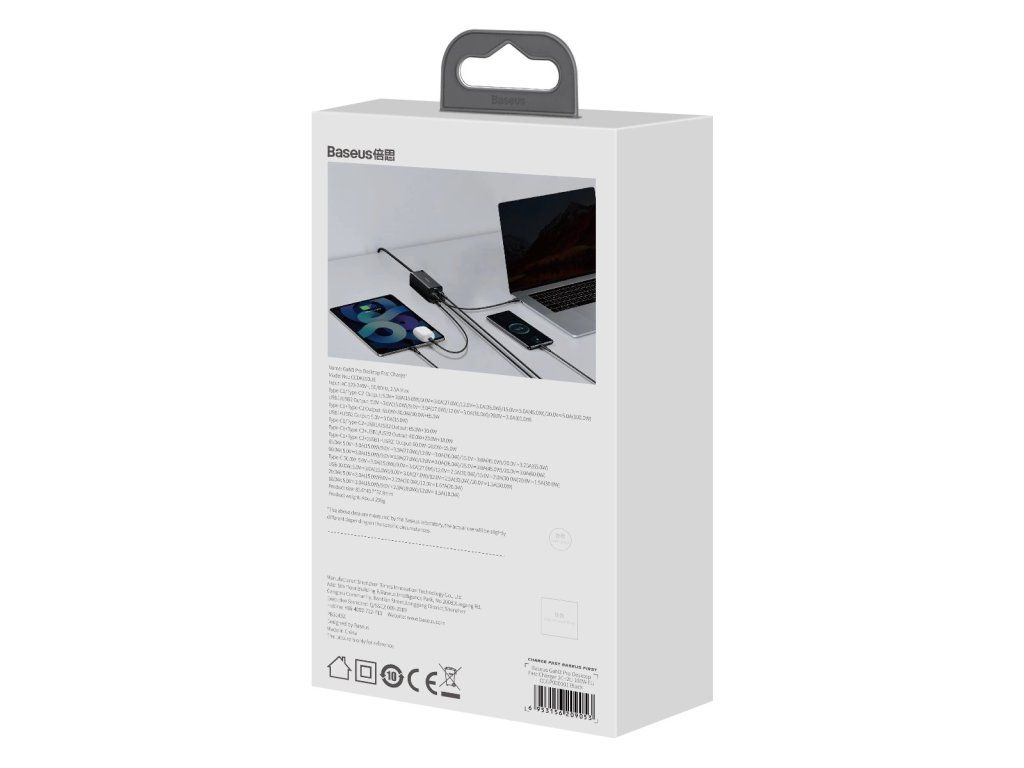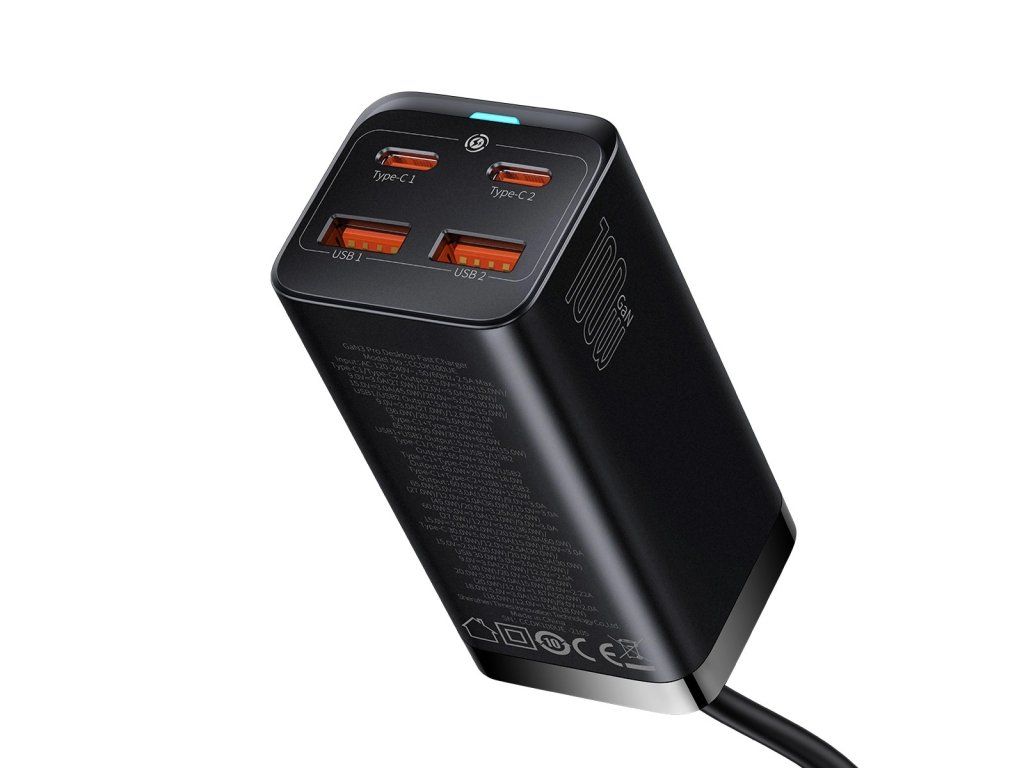 Baseus GaN3 Pro 100W stolní rychlonabíječka Vlastnosti * výstupní výkon 100W * standard rychlého nabíjení: PPS (programovatelný napájecí zdroj), SCP (Huawei Super Charge Protocol), QC (Qualcomm Quick Charge), FCP (Huawei Fast Charge Protocol), AFC (Adaptivní rychlé nabíjení Samsung) * nabíjení až čtyř zařízení současně * technologie regulace teploty BCT * technologie nabíjení BPSII * balení obsahuje kabel USB-C/USB-C Technické parametry Výstupní proud: * USB-C1/USB-C2: 5V/3A, 9V/3A, 12V/3A, 15V/3A, 20V/5A Max * USB 1/USB 2: 5V/4,5A, 9V/3A, 12V/3A, 15V/3A, 20V/3A Max * USB-C1 + USB-C2: 65W + 30W/30W + 65W * USB 1 + USB 2: 5V/3A * USB-C1/USB-C2 + USB 1/USB 2: 65W + 30W * USB-C1 + USB-C2 + USB 1/USB 2: 60W + 20W + 18W * USB-C1 + USB-C2 + USB 1 + USB 2: 60W + 20W + 15w Vstupní proud: AC 100-240V ~50/60Hz 2,5A max. Porty: * 2x USB-C * 2x USB-A Barva: černá Rozměry: 85,6x40,7x37,8mm Hmotnost: 295g Záruka: 2 roky