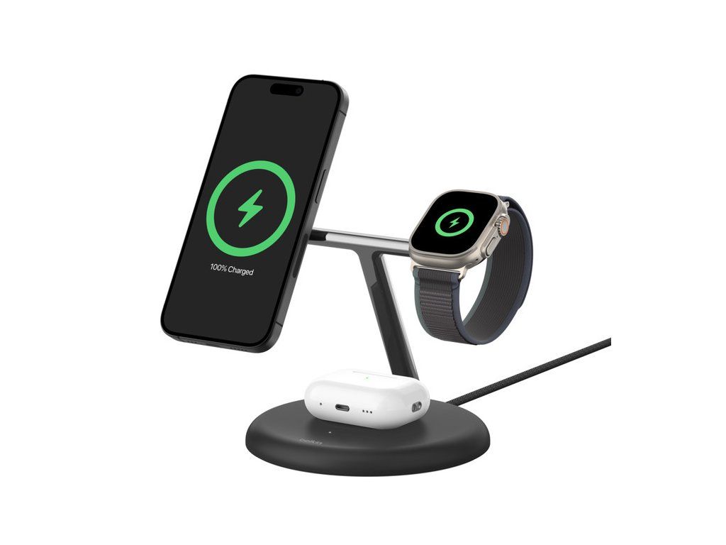 Nová generace naší oblíbené nabíjecí stanice 3 v 1 je kompatibilní s Qi2. Magnetická podložka pro iPhone je otočná a stojánek je menší. Bezdrátově nabíjejte svůj iPhone 15, 14, 13 a 12 dvakrát rychleji a použijte 5 W pro nabíjení Apple Watch a AirPods. Vzhledem k tomu, že je použita magnetická technologie Qi2, je zarovnání perfektní, takže energie může být přenášena optimálně a bezpečně a baterie vašeho zařízení je chráněna. *Rychle nabijte svůj iPhone bezdrátově až 15 W pomocí Qi2 *Qi2 optimalizuje spotřebu energie a prodlužuje životnost baterie zařízení *Rychlé nabíjení Apple Watch Series 9, 8, 7 a Apple Watch Ultra a Ultra 2 *Bezdrátově nabíjejte 3 zařízení současně: iPhone, Apple Watch a AirPods *iPhone lze naklonit až o 90° do požadovaného pozorovacího úhlu *Technologie Qi2 pro snadné magnetické umístění ve správné orientaci *Vhodné pro nastavení displeje iPhonu přes pohotovostní režim *LED ukazuje stav nabíjení *Obsahuje 36W napájecí adaptér s integrovaným USB-C kabelem *Kompatibilní s pouzdry na iPhone do 3 mmDodatočné parametre