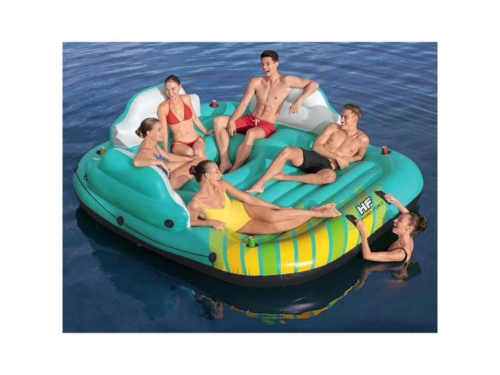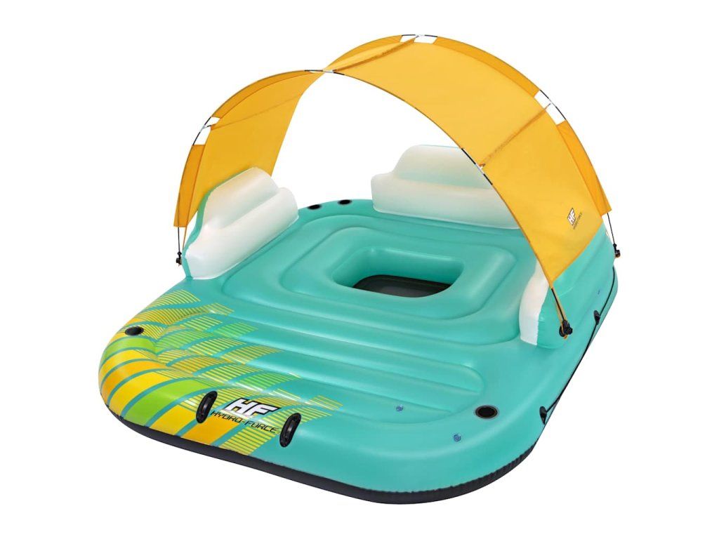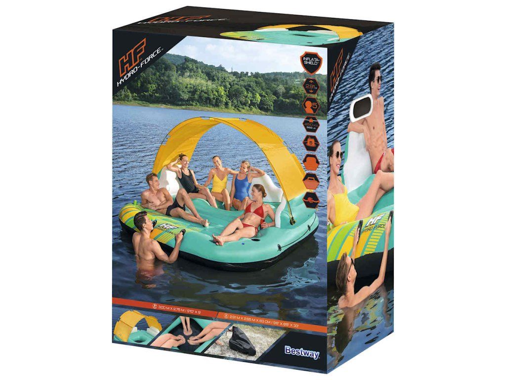 Toto plávajúce lehátko má priestrannú plochu, na ktorú sa zmestí až 5 osôb s maximálnou nosnosťou 450 kg. Prsty na nohe si môžete ponoriť do vody v strednej časti so sieťovinou. Súčasťou je odnímateľná slnečná clona, aby ste v horúcich letných dňoch zostali v tieni. Strieška dokáže zablokovať väčšinu škodlivých lúčov. Ostrov je navrhnutý s 5 držiakmi pohárov na uloženie nápojov a občerstvenia. 2 odolné rúčky vám umožnia ľahké vchádzanie aj vychádzanie z ostrovčeka. Tri podporné operadlá poskytujú väčšiu oporu a pohodlie počas ležania.