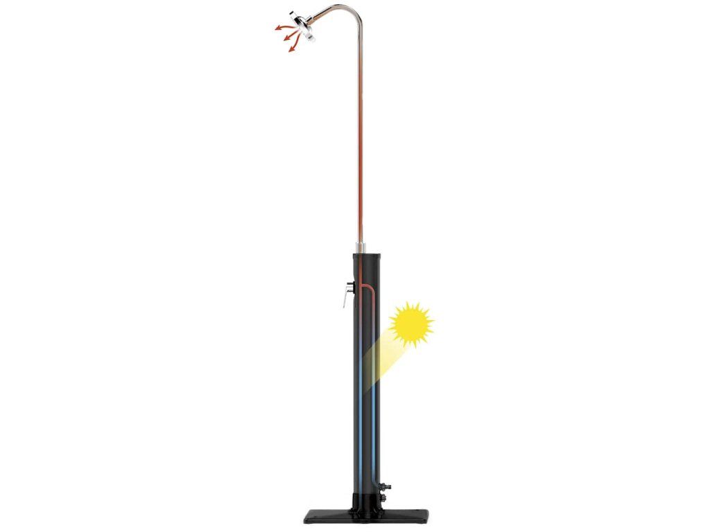 - Teplá sprcha: Nechajte vodu v nádrži s objemom 8 l (2,1 gal.), aby sa zohriala na slnku.