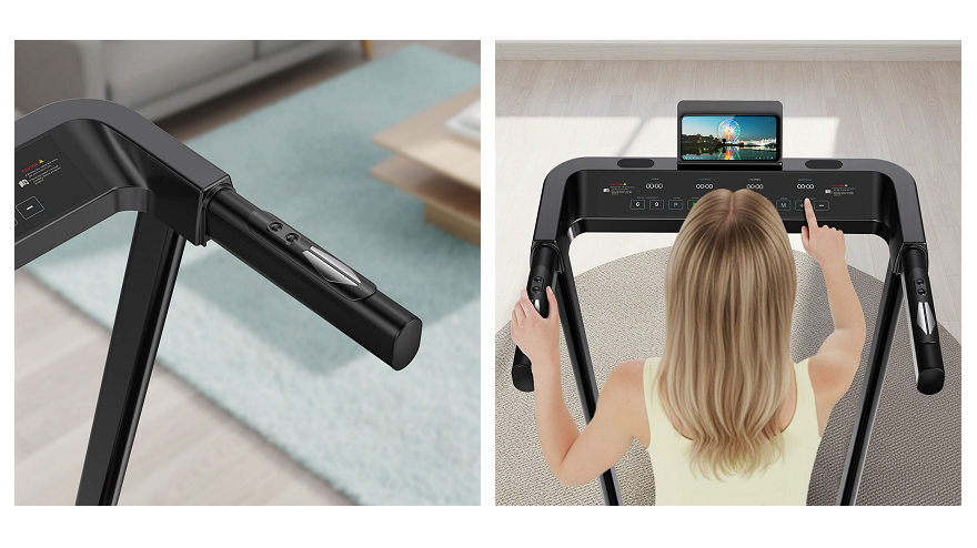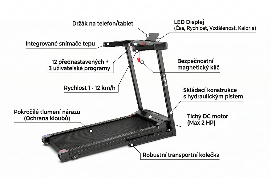 Hlavní výbava: Snímače tepu, LED displej, tlačítka rychlého přístupu, bezpečnostní klíč, držák na telefon/tablet, systém odpružení, skládací konstrukce, transportní kolečka – Komplexní výbava pro pohodlný a bezpečný trénink.