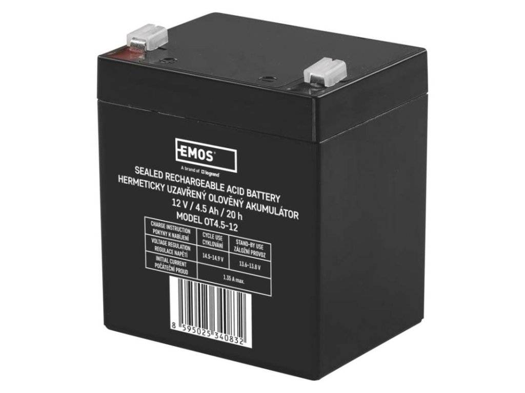 bezúdržbový: áno|chemické zloženie: Pb|EPS (elektronické požiarne systémy): áno|EZS (elektronické zabezpečovacie systémy): áno|hmotnosť: 1,46 kg|kapacita: 4,5 Ah|napätie: 12 V|núdzové osvetlenie: nie|optimálna životnosť: 5 rokov|PARADOX: nie|predajný obal: 1 ks|rozmer: 91 × 71 × 105 mm|technológia: AGM|terminál: faston 4,7 mm|UPS (záložné zdroje): áno|ÚSTREDNE JABLOTRON JA100K: nie|ÚSTREDNE JABLOTRON JA106K: nie|ÚSTREDNE JABLOTRON JA106K(R): nie|ÚSTREDNE JABLOTRON JA82K: nie|ÚSTREDNE JABLOTRON JA83: nie|záložné batérie pre výťahy - osvetlenie, hovor: ánoDodatočné parametre