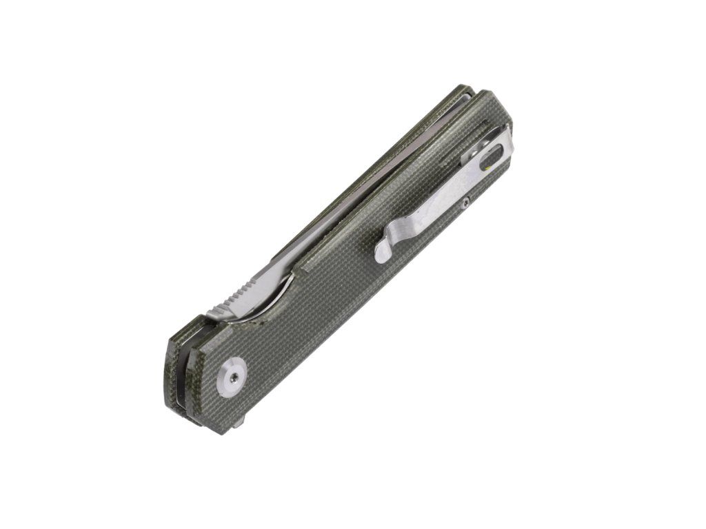 Rukoväť je z materiálu Micarta v zelenej farbe, so sponou na vrecká.