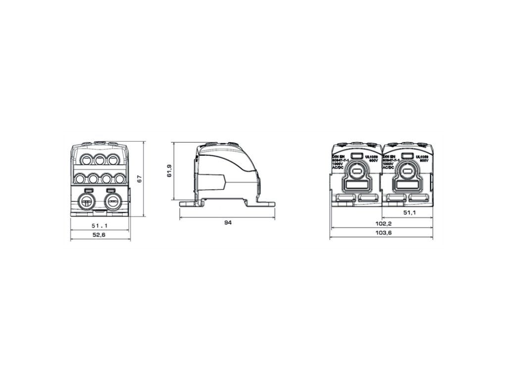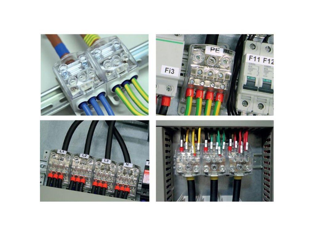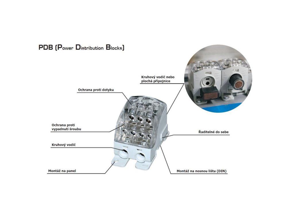 Blok pro rozdělení fází PDB 490 (dříve značeno PVB 400), 1pólový, pro CU vodiče, jmenovitý proud 490A, jmenovité napětí 690V, barva šedá / průhledné víko, montáž na DIN lištu / PANEL, krytí IP20, vstup 1x185mm2 a 24x10mm plochý vodič, výstup 2x35mm2, 3x25mm2, 4x16mm2. PDB (Power Distribution Blocks)Bloky pro rozdělení fází (rozváděčové bloky) PDB slouží pro rozdělení přívodního kabelu/vodiče/sběrnice o velkém průřezu na několik menších průřezů. Přívod může být jak kulatý, tak plochý typ vodiče. Bloky značně šetří místo v rozváděčích oproti klasickým třmenovým svorkám. Díky plastovému krytu je zajištěna ochrana před nebezpečným dotykem živých částí. Jsou určeny k instalaci na nosnou lištu 35 mm (s možností dodatečného upevnění šroubem). Vyráběny jsou až do proudové zatížitelnosti 490 A. Povrchově upravená svorka je vhodná pro měděné vodiče. Vodiče se do svorek po odizolování připevňují pomocí šroubového spojení. Šroub dosedá přímo na vodič, proto je nutné jemně slaněné vodiče opatřit dutinkou. Dutinka ale zvětší průřez vodiče a proto je nutné připojovat slaněné vodiče o řád menší než uvedené průřezy. U pevných vodičů toto není nutné. Bloky PDB jsou řaditelné do sebe.