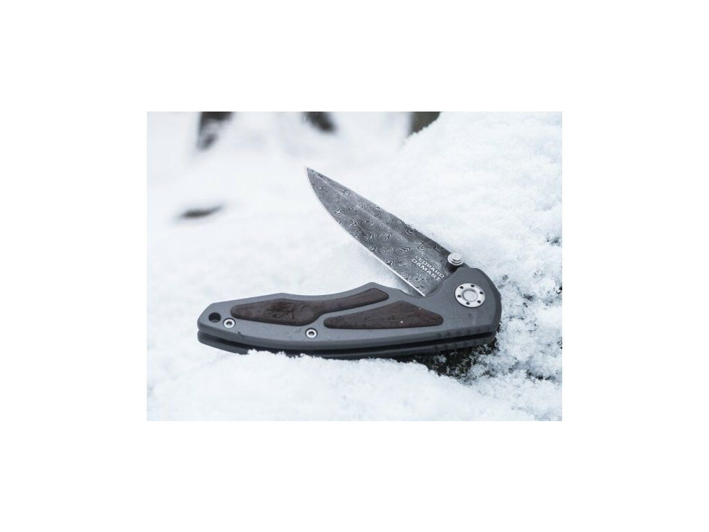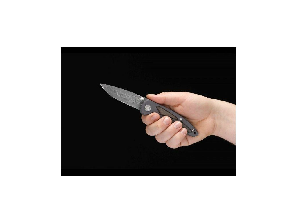 Má čepeľ s hladkou hranou typu Drop Point z 300 vrstvovej damaškovej ocele vo vzore "Malá pyramída", otvára sa manuálne obojstrannými palcovými kolíkmi a zaisťuje ju poistka Linerlock.