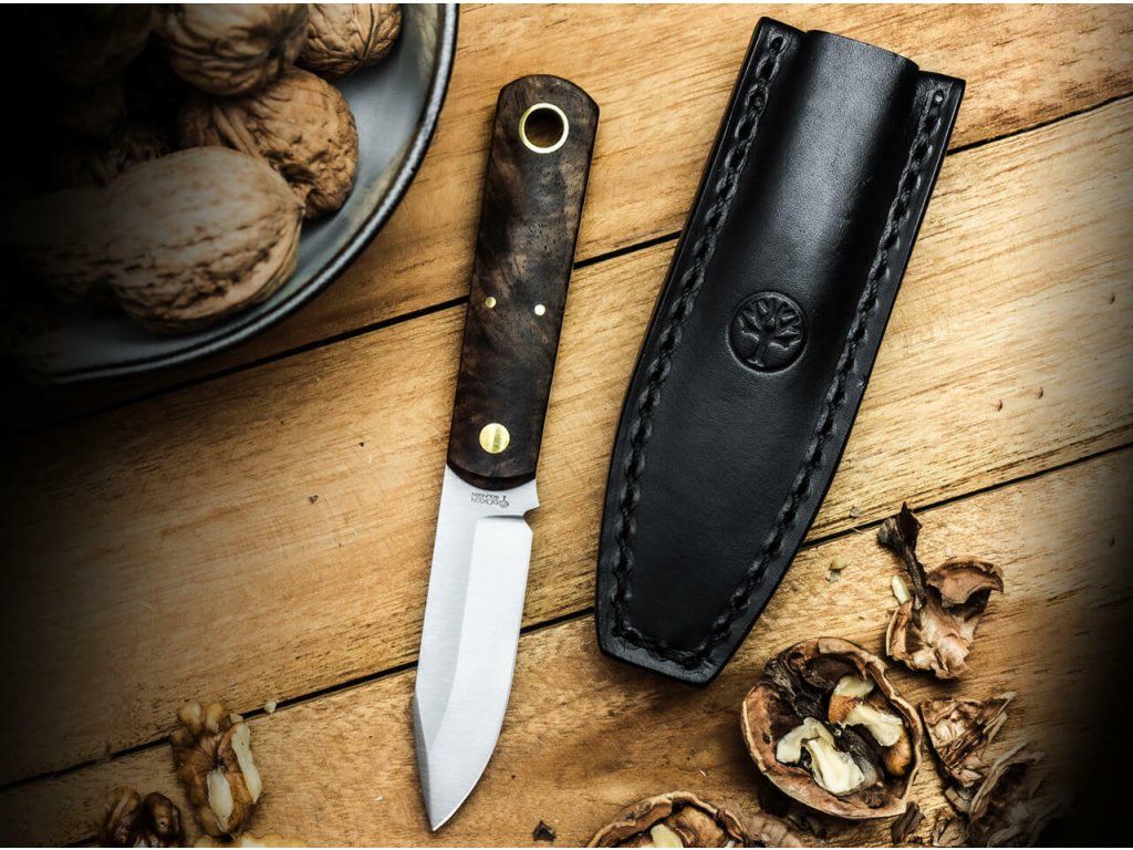 Rukoväť vyrobená z orechového dreva dodáva nožu elegantný rustikálny vzhľad. Je doplnená mosadznými nitmi a otvorom na šnúrku.