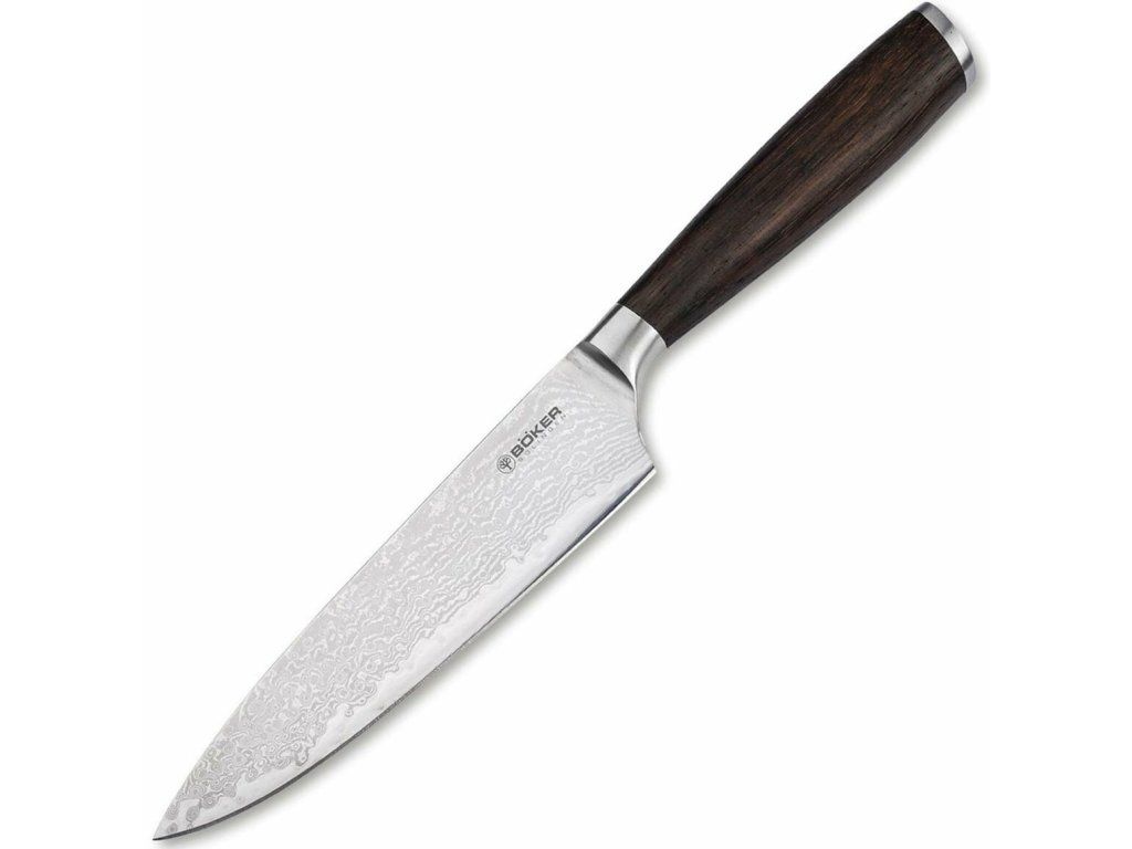 Menší šéfkuchársky nôž Böker Manufaktur Solingen Chef Knife zo série Meisterklinge Damast je základným nožom v každej kuchyni. Nakrája mäso, zeleninu, ovocie i ryby.