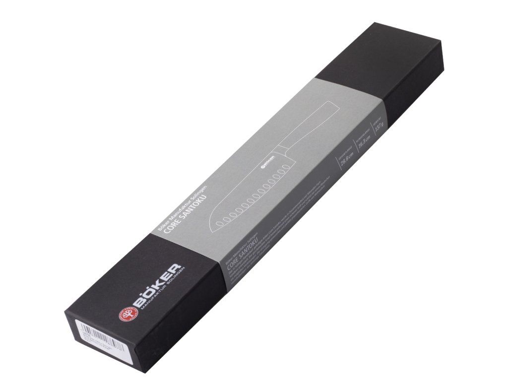 Japonský kuchynský nôž Böker Manufaktur Solingen Santoku zo série Core v preklade znamená "Tri cnosti" a hodí sa na mäso, ryby aj zeleninu.