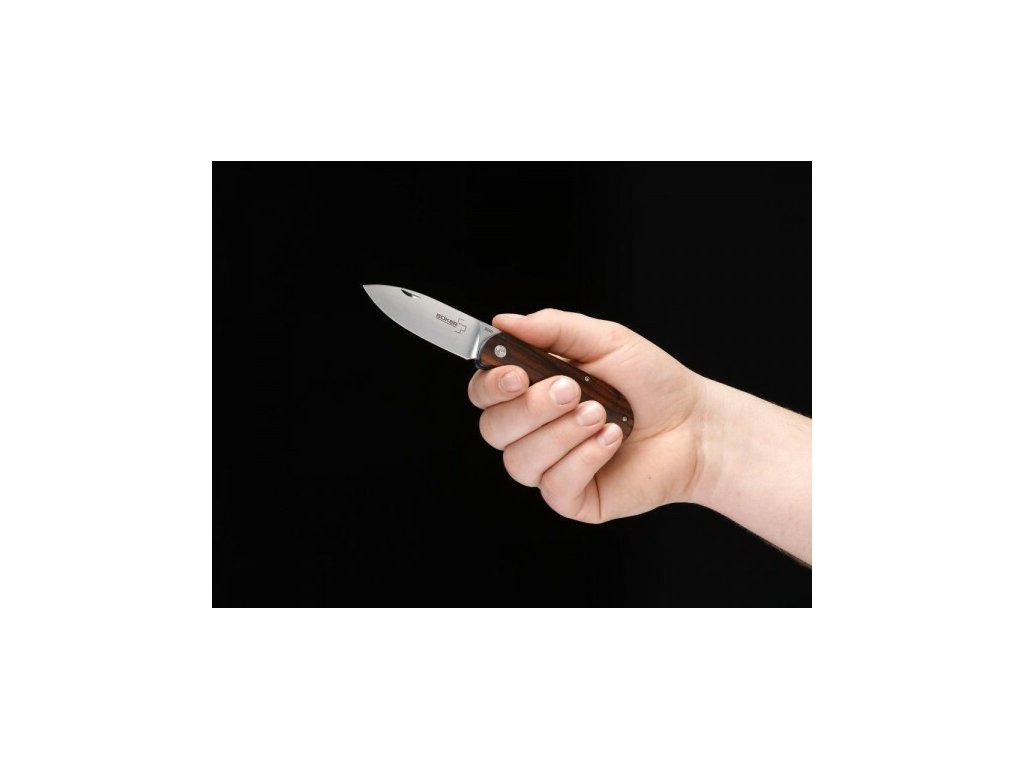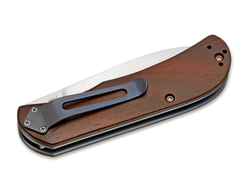 Rukoväť je z elegantného dreva Cocobolo s vložkami z eloxovaného titánu. So sponou na vrecká.