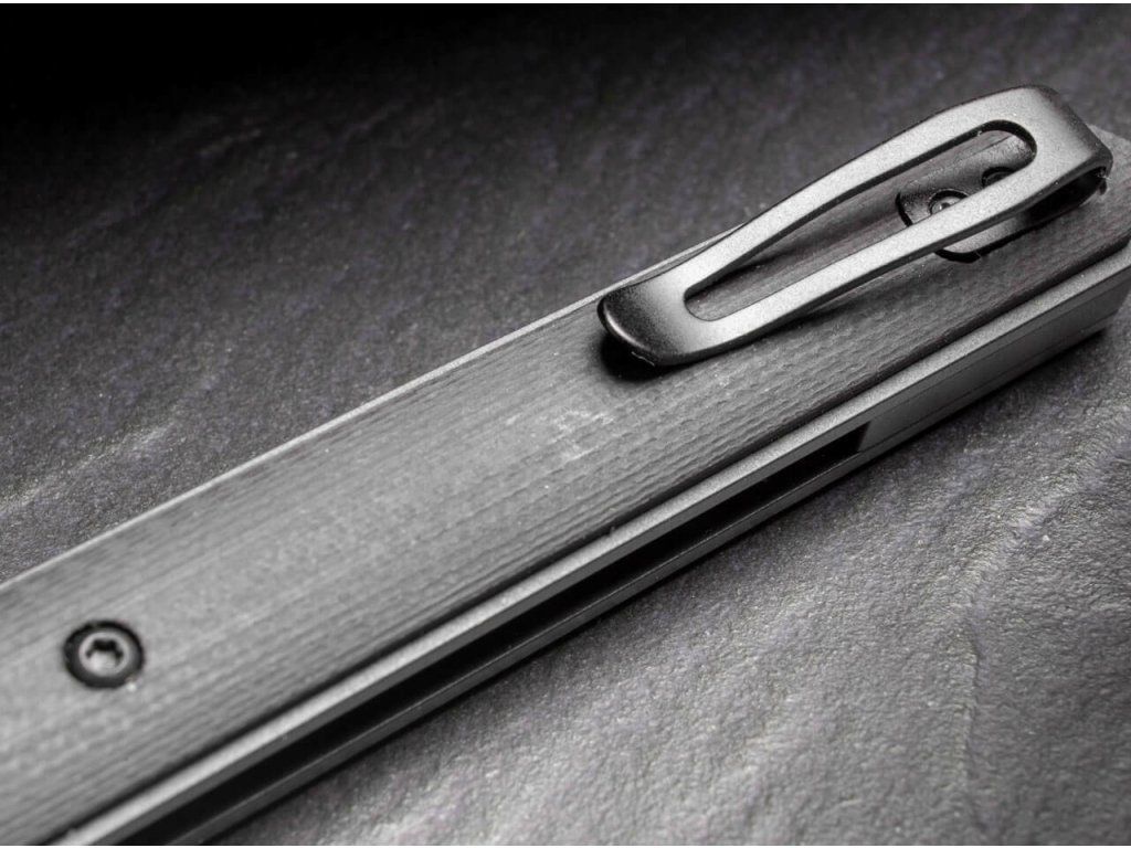 Rukoväť je z odolného materiálu G10 v čiernej farbe, so sponou na vrecká.