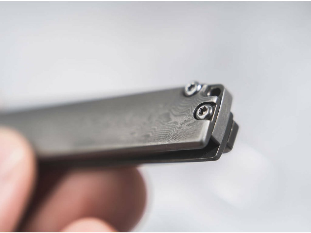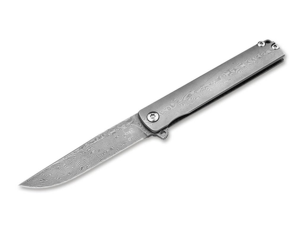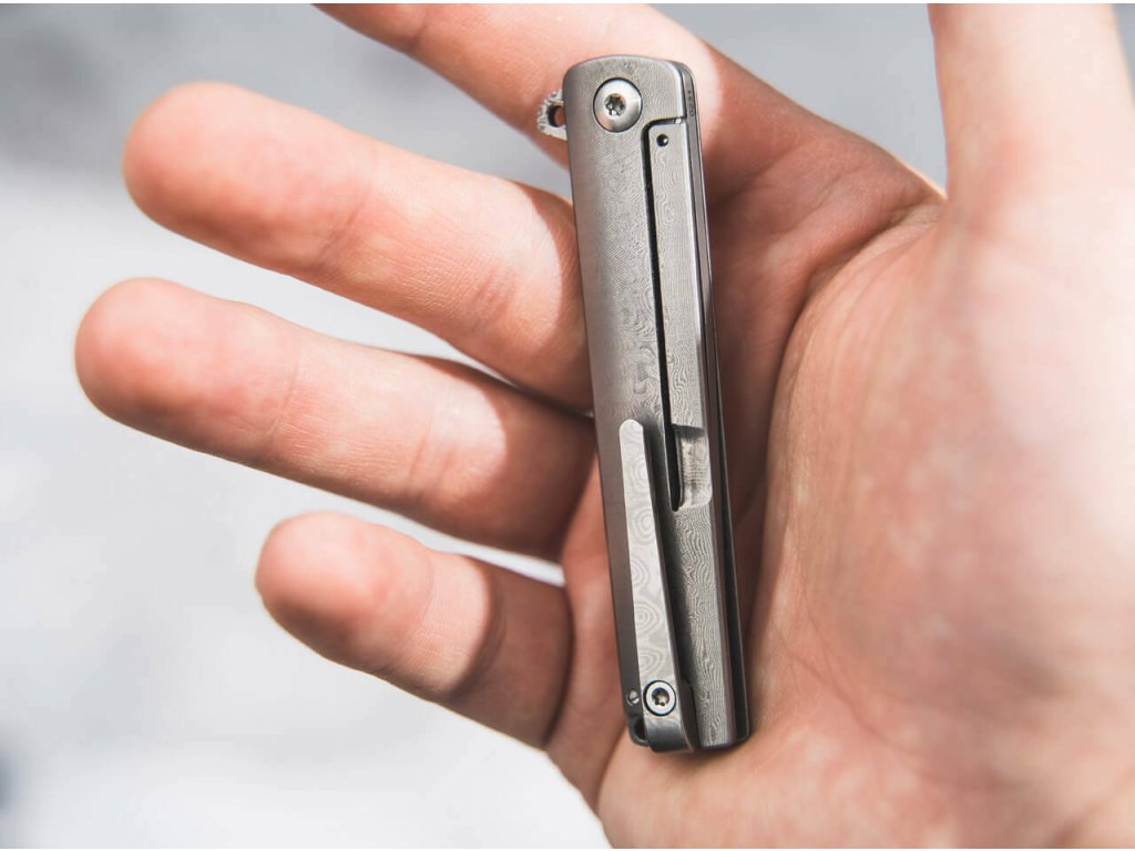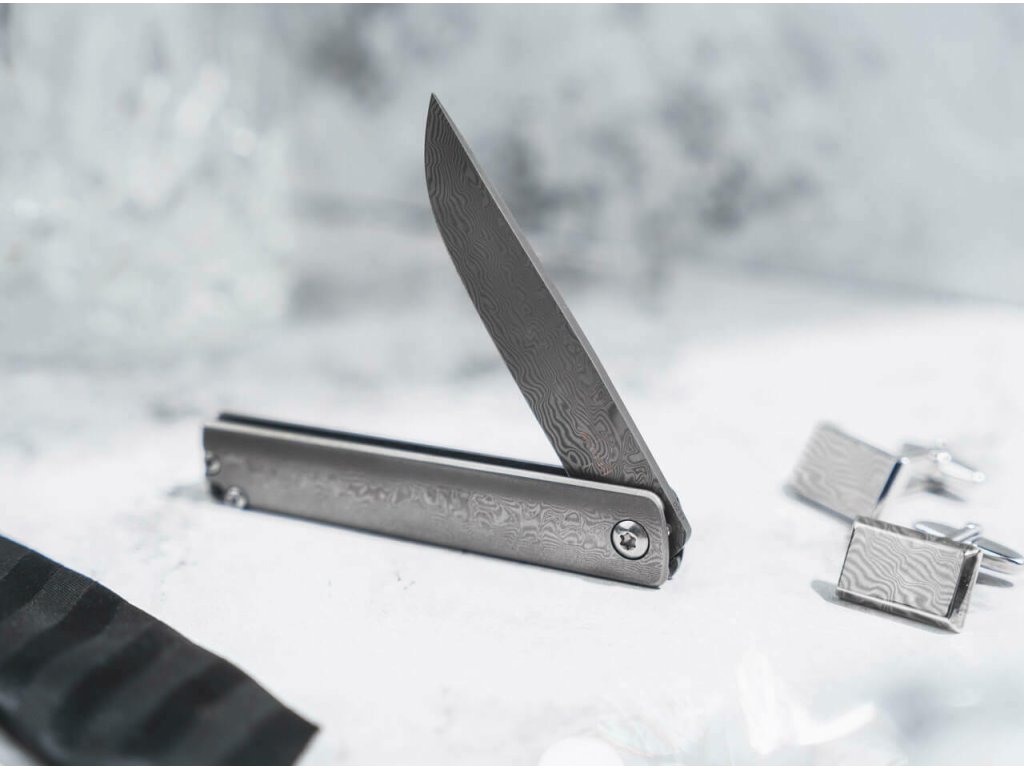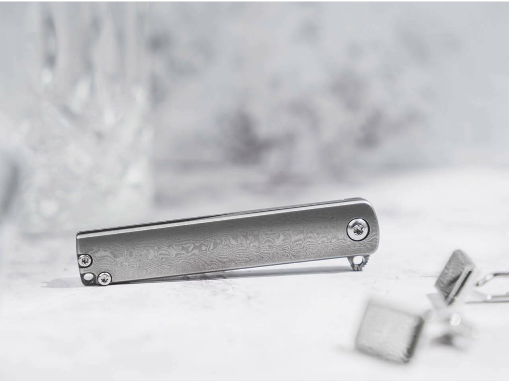 S čepeľou s hladkou hranou zo 110 vrstvovej damaškovej ocele, leží na guľôčkových ložiskách a otvára sa vyklápačom Flipper. Zaisťuje ju Framelock.