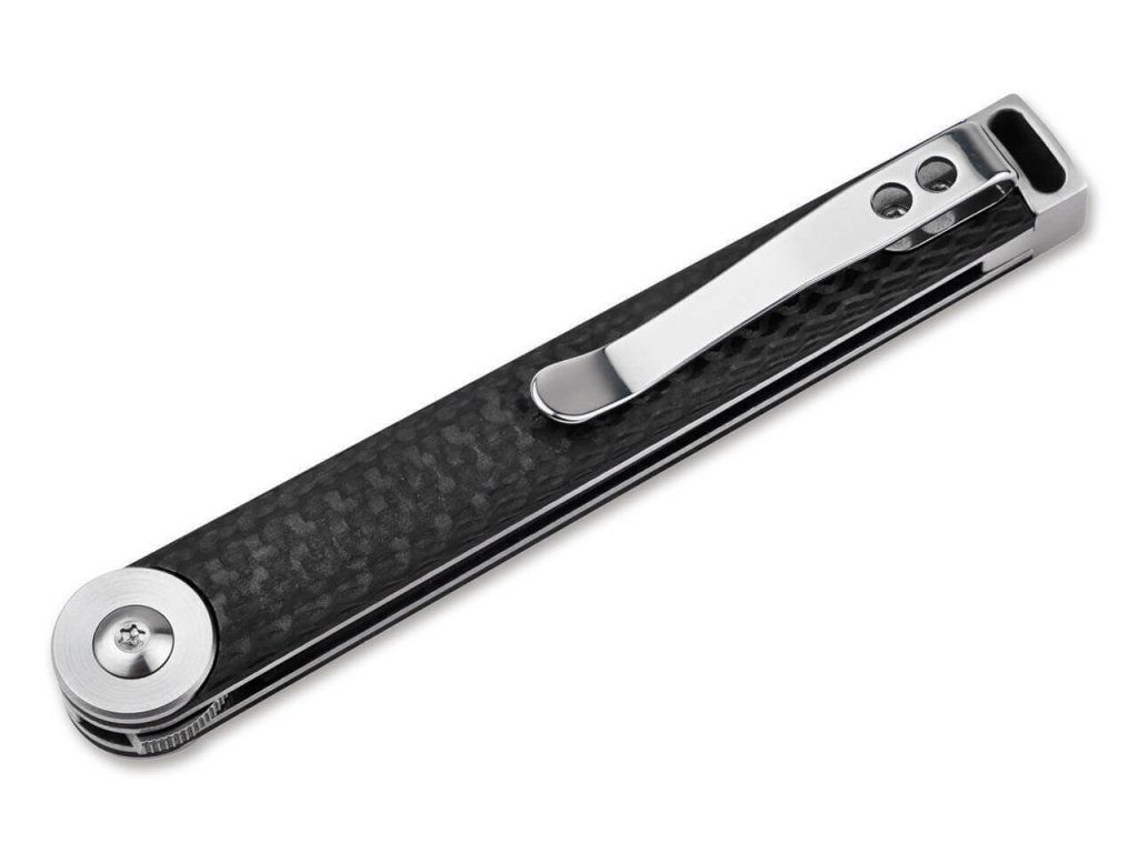 Rukoväť je vyrobená z odolných uhlíkových vlákien, s dierkou na šnúrku a sponou na vrecká.