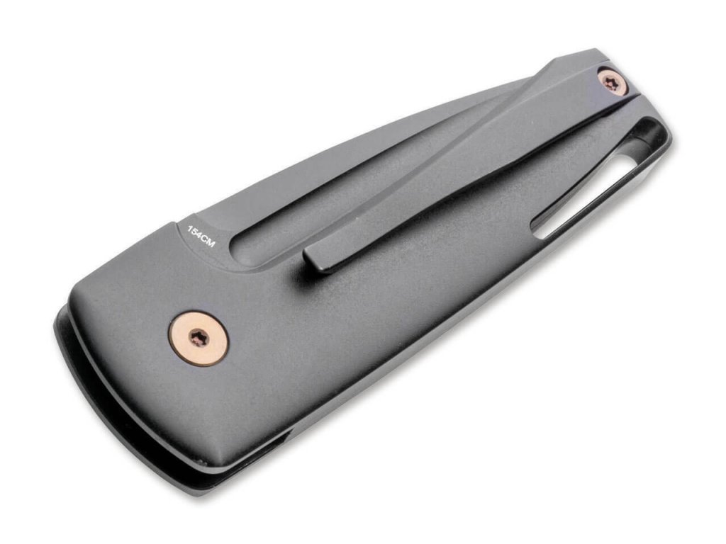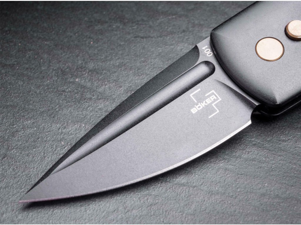 Má čepeľ s hladkou hranou z ocele 154 cm s čiernou povrchovou úpravou, otvára sa automaticky tlačidlom a uzamyká pomocou posuvného zámku s čistou západkou, čím sa zabráni náhodnému uvoľneniu.