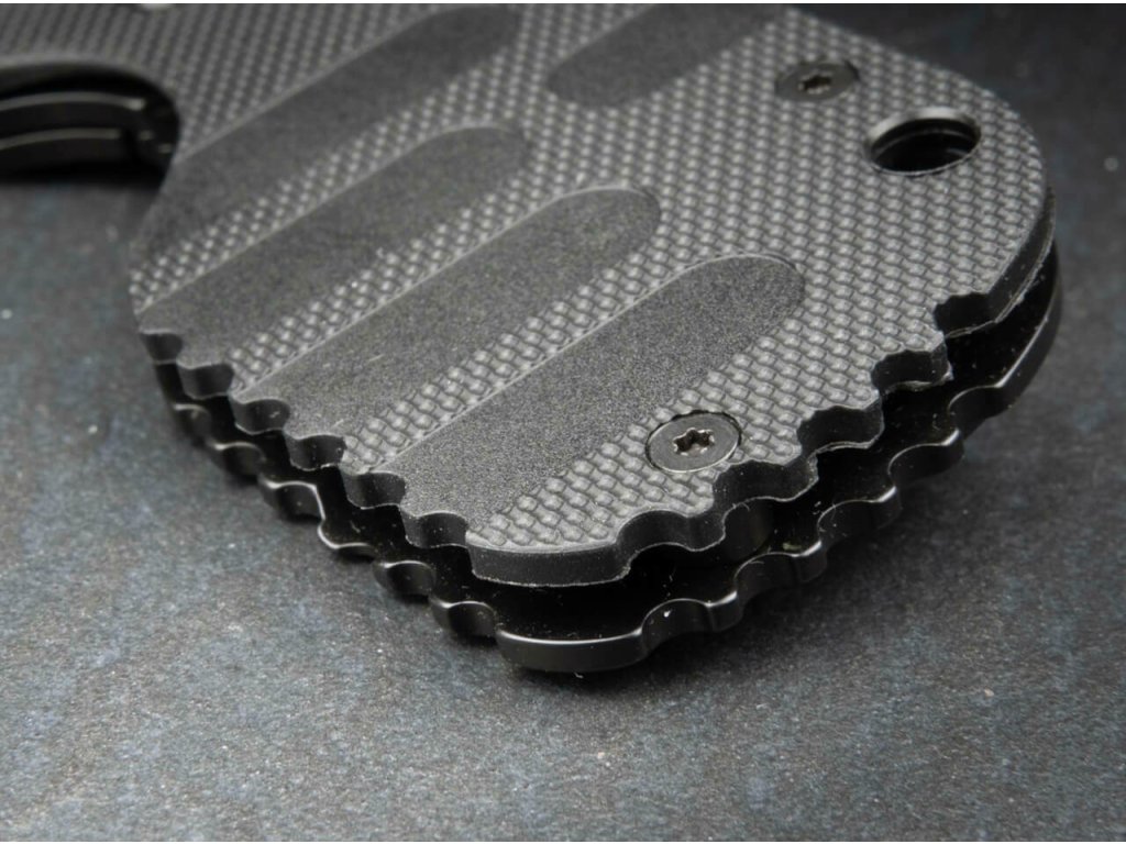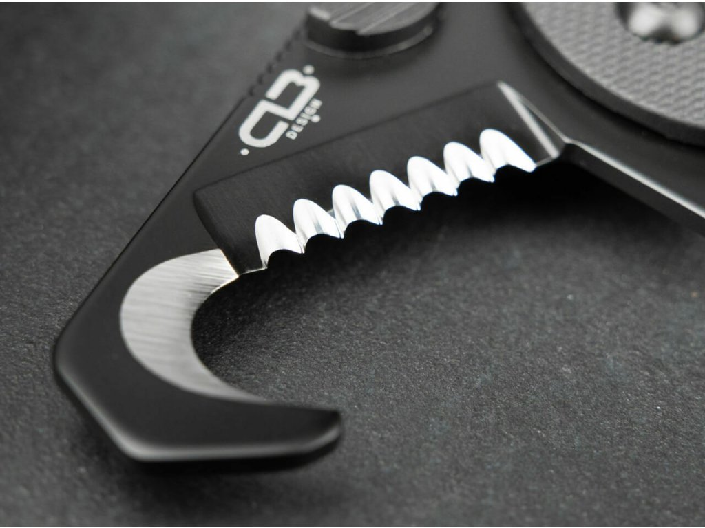 Má čepeľ z nástrojovej ocele D2 s čiernym povrchom, so zúbkovanou hranou a rezačom pásov. Otvára sa palcovým kolíkom a zaisťuje ju Framelock.