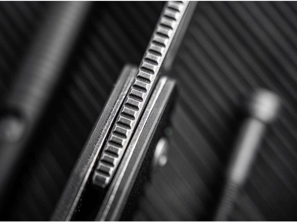Má čepeľ s hladkou hranou z nástrojovej ocele D2 s povrchovou úpravou Stonewash, otvára sa otvorom na palec, predným vyklápačom alebo drôteným vyklápačom. Zaisťuje ju poistka Linerlock.