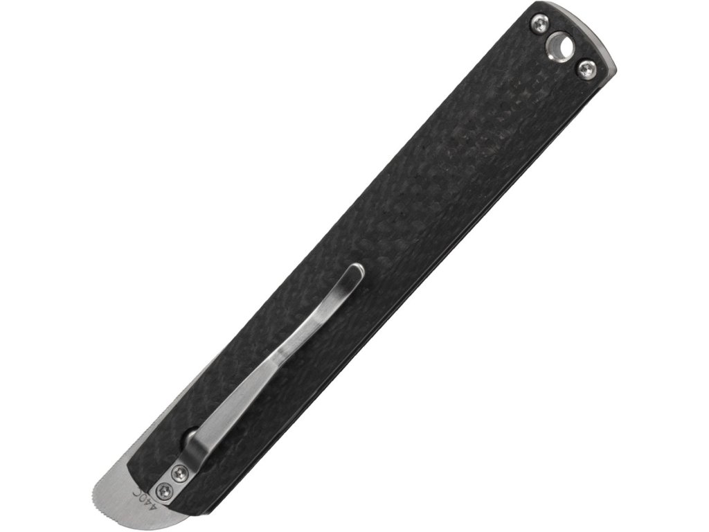 Rukoväť je z uhlíkových vláken s vložkami z nehrdzavejúcej ocele. S dierkou na šnúrku a sponou na vrecká.