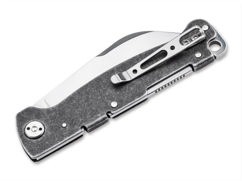 Rukoväť je z nehrdzavejúcej ocele so Stonewash povrchom, s dierkou na šnúrku a sponou na vrecká.