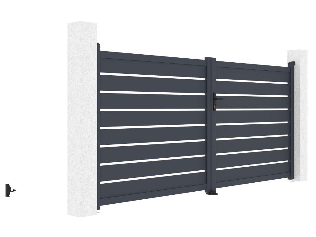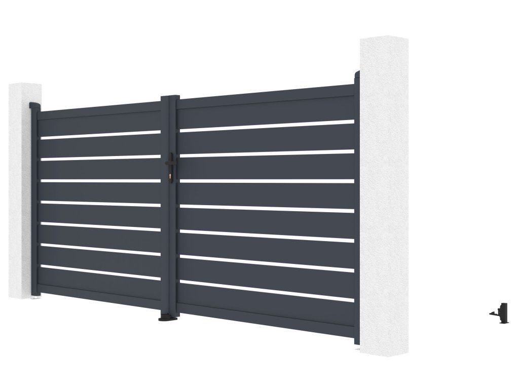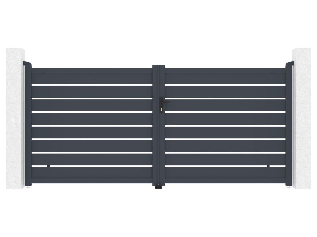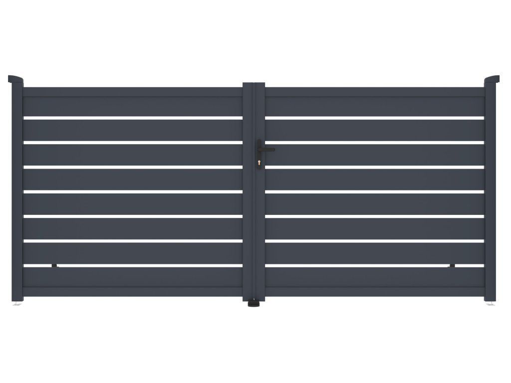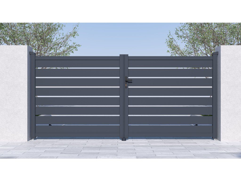 Výplň s horizontálne uloženými lamelami v atraktívnom grafitovom prevedení kombinuje dostatok súkromia s moderným dizajnom, takže brána s otváraním dovnútra pristane každému typu oplotené stavby.