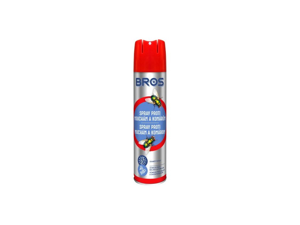 BROS sprej proti muchám a komárom 400 ml je aerosólový prípravok, ktorý pôsobí okamžite. Používa sa v interiéri a hodí sa okrem múch a komárov aj na mole, šváby, octomilky vošky a iný lietajúci či lezúci hmyz. "Používajte biocídy bezpečným spôsobom. Pred použitím si vždy prečítajte etiketu a informácie o výrobku."