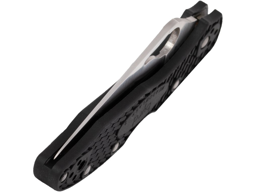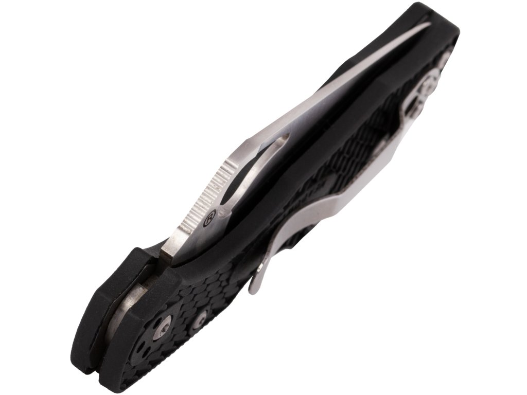 Rukoväť je z textúrovaného čierneho FRN, s dierkou na šnúrku a sponu na opasok/vrecká.