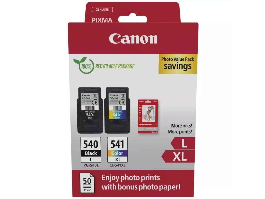 Canon PG-540L/CL-541XL Ink cartridge PVP, černá (black) + barevná (colour) + fotopapír, výtěžnost 300 str. černá, 400 str. barevná Kompatibilní s Pixma: MX475 MX515 MX455 MX435 MX395 MX375 MG4250 MG4150 MG3550 MG3250 MG3150 MG2250 MG2150 MX525 MX535 TS515 TS515 MG3650S MG3650Dodatočné parametre
