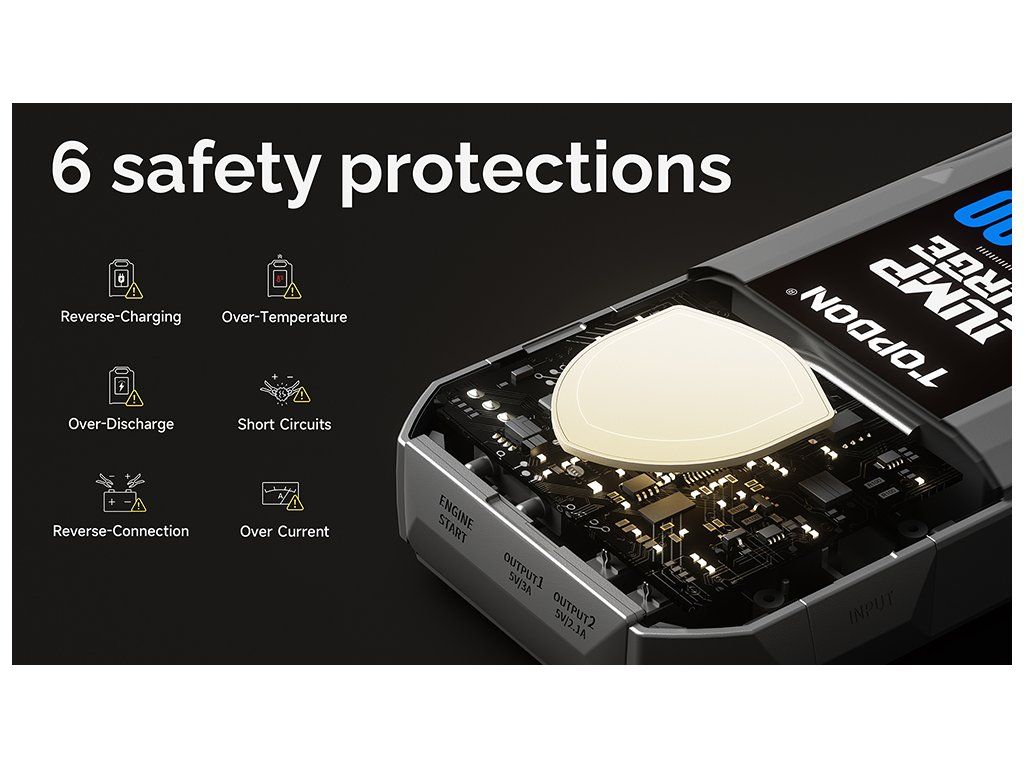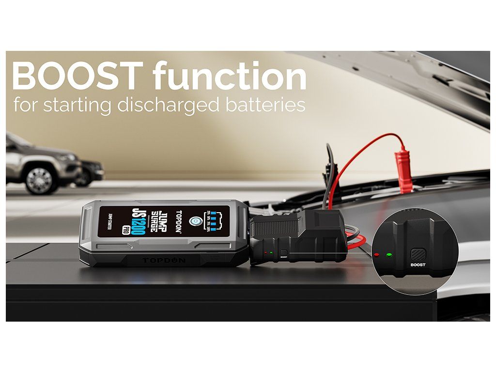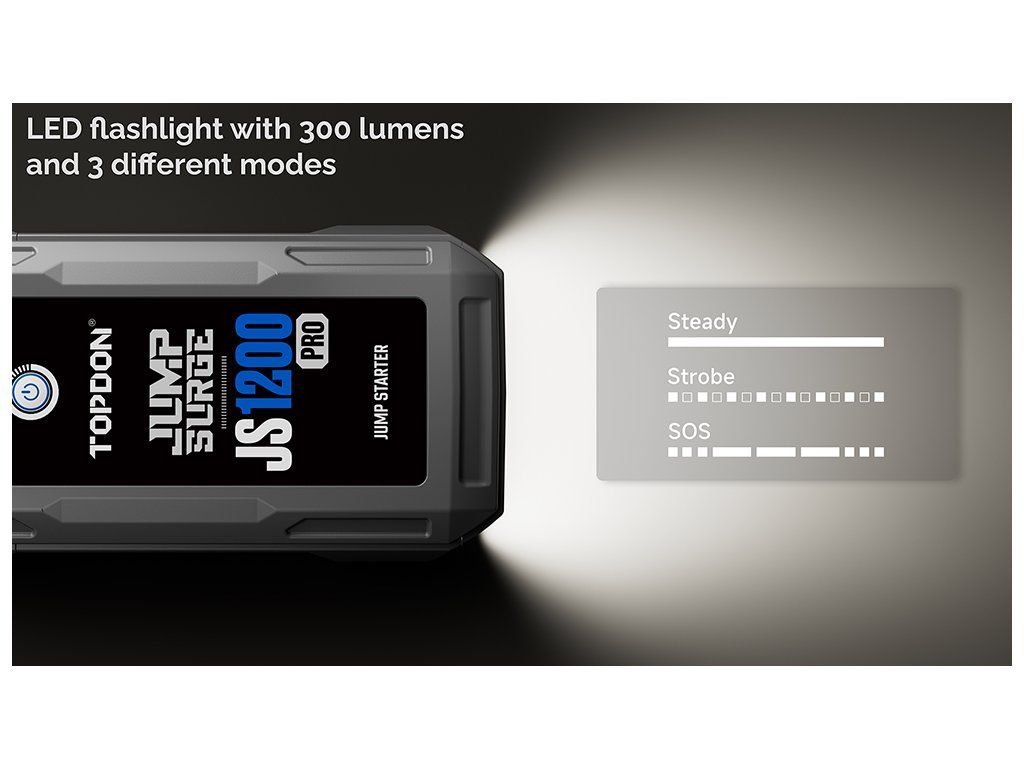Kapacita baterie 10000mAh/37Wh • maximální výstupní proud pro start vozidla 1800A • 2x USB-A výstup (5V/3A (15W)). • USB-C vstup/výstup (PD18W, 5V/3A (15W), 9V/2A (18W)) • DC Jack výstup (16,8V/10A (168W)) • LED svítilna (stálé světlo, stroboskop, SOS) • všestranná elektrická ochrana • ochrana IP64 • hmotnost 750g Car Jump Starter Jumpsurge 1200 PRO Maximálně spolehlivý a výkonný car jump startér JumpSurge 1200 PRO s kapacitou 3,7V, 10000mAh (37Wh) a špičkovým startovacím proudem až 1800A je ideální zařízení, které vám poslouží jako startovací zdroj pro vaše vozidla, lodě, motocykly, skútry. JumpSurge 1200 PRO vám umožní oživit baterii a nikdy nezůstat na cestách bez pomoci! Klíčové vlastnosti: •Špičkový výstupní proud až 1800A pro ještě lepší startovací schopnosti. •Funkce Boost pro start vybitých nebo poškozených baterií. •Inovativní senzory Stop Spark™ pro zvýšenou bezpečnost při používání. •Kvalitní Li-ion baterie s kapacitou 10000mAh. •USB-C vstup/výstup s podporou PD18W (5V/3A, 9V/2A) pro rychlé nabíjení zařízení a samotného startéru. •Výkonné LED světlo se třemi módy (stálé, SOS, stroboskop) s výkonem 300 lumenů. •Prémiové měděné startovací klipy s ochranou proti přepólování a dalšími bezpečnostními funkcemi. •Start vozidel do 4.0L pro dieselové motory, do 6.5L pro benzínové motory. •Celkem 6 bezpečnostních elektrických ochran - ochrana proti zkratu, nadproudová ochrana, ochrana proti přepólování, ochrana proti zpětnému nabití, ochrana proti přehřátí, ochrana proti nadměrnému vybití •Provozní teplota od -10°C do +40°C. •Robustní vnější pouzdro odolné proti prachu a opotřebení s ochranou IP64 proti vodě a prachu. •Bohaté příslušenství včetně nabíjecího kabelu s USB-C, pouzdra a startovacích kabelů. •Maximální bezpečnost produktu. Funkční a bezpečný! Se svým zvýšeným startovacím výkonem 1800A nastartuje váš dopravní prostředek při vybité baterii až do maximálního objemu 4.0L pro naftový motor a 6.5L pro benzínový motor. Tento car jump startér můžete používat pro pohotovostní starty nejen vozidel, ale i motocyklů, skútrů, lodí, čtyřkolek, sněžných skútrů, karavanů, osobních i nákladních vozidel s 12V okruhem. Je vybaven funkcí Boost, která dokáže nastartovat vybitou nebo poškozenou baterii. JumpSurge 1200 PRO je vybaven chytrým a bezpečným systémem, který poskytuje 6 různých ochran pro bezpečí zařízení i automobilu. Inovativní senzory Stop Spark™ přidávají další vrstvu ochrany proti jiskření, což zvyšuje bezpečnost při manipulaci. Navíc obsahuje bezpečnostní kontrolky, které upozorňují na nesprávné použití nebo nesprávné připojení, a poskytuje tak dodatečnou ochranu, kterou potřebujete. Toto 1800A zařízení nastartuje baterie během 1 až 2 sekund. Powerbanka JumpSurge 1200 PRO slouží také jako powerbanka! Pomocí dvou USB-A výstupů a kompatibilního kabelu dokáže plně nabít váš smartphone, tablet a jakékoli kompatibilní elektronické zařízení. Dále JumpSurge 1200 PRO podporuje nabíjení elektronického zařízení pomocí konektoru typu Jack 5521 s maximálním výkonem 16,8V/10A max. Odolný a praktický! Součástí tohoto výrobku je LED svítilna se svítivostí 300 lumenů a 3 různými režimy: stálé světlo, stroboskop a SOS. Bude se vám hodit při stanování, kempování, rybaření nebo jako výstražná SOS svítilna. Navíc díky ochraně IP64 je toto zařízení chráněno před vodou a prachem a díky robustnímu provedení odolá i nechtěným pádům. Novinky a vylepšení v Car Jump Starter JumpSurge 1200 PRO: •Maximální špičkový proud: 1800A (JumpSurge 1200 PRO) oproti 1200A (JumpSurge 1200). •Bezpečnostní funkce: Přidání senzorů Stop Spark™ u modelu PRO. •USB-C vstup/výstup: Nově rychlonabíjení PD pro USB-C u modelu PRO. •Kvalita svorek: Prémiové měděné svorky u modelu PRO. •Robustnost: Zvýšená odolnost vůči prachu a opotřebení u modelu PRO. Obsah balení: 1 ks - Car Jump Starter JumpSurge 1200 PRO 1 ks - Manuál 1 ks - Ochranný textilní obal 1 ks - Bateriové svorky 1 ks - USB-C nabíjecí kabel Technické specifikace: Značka: TOPDON Model: Car Jump Starter JumpSurge 1200 PRO Kapacita: 3,7V , 10000mAh/37 Wh Typ baterie: Li-ion USB-A (2x)výstup: 5V/3A (15W) USB-C vstup/výstup: PD18W, 5V/3A 15W, 9V/2A (18W) DC Jack výstup: 16,8V/10A (168W) Rozměry: 8,5 x 17,5 x 3 cm Hmotnost: 750 g Max. výstupní proud pro vozidla: 1800A LED světlo: stálé, stroboskop, SOS světlo Provozní teplota: od -10°C do 40°C Skladovací teplota: od -20°C do 75°C Ochrana: IP64Dodatočné parametre