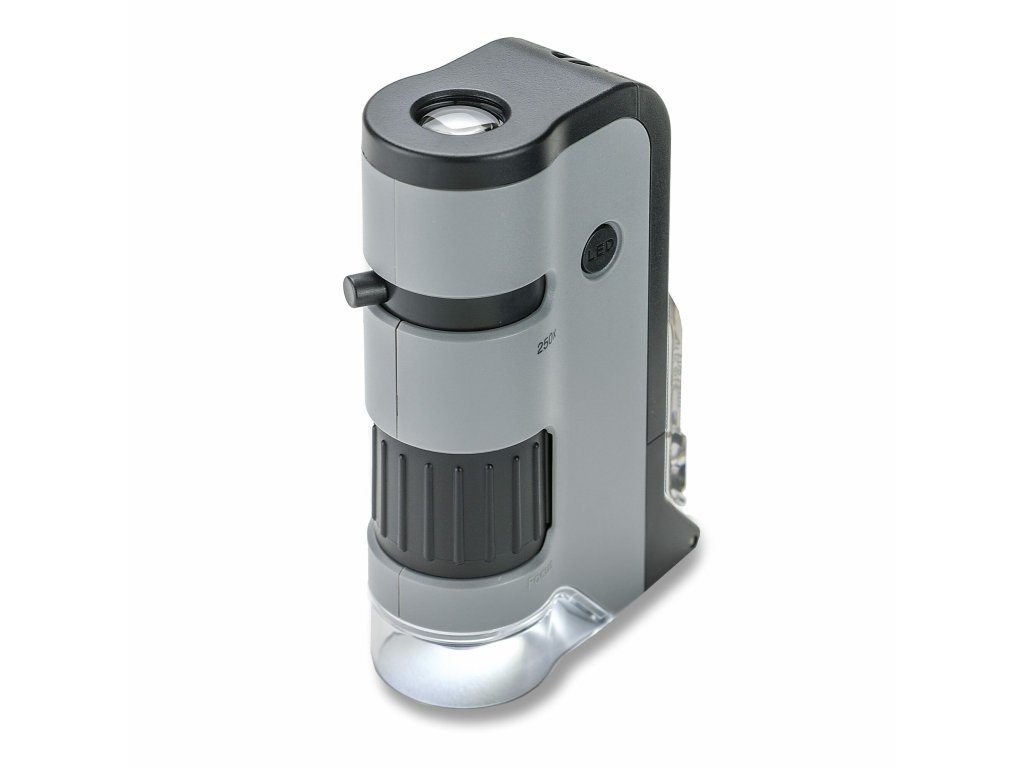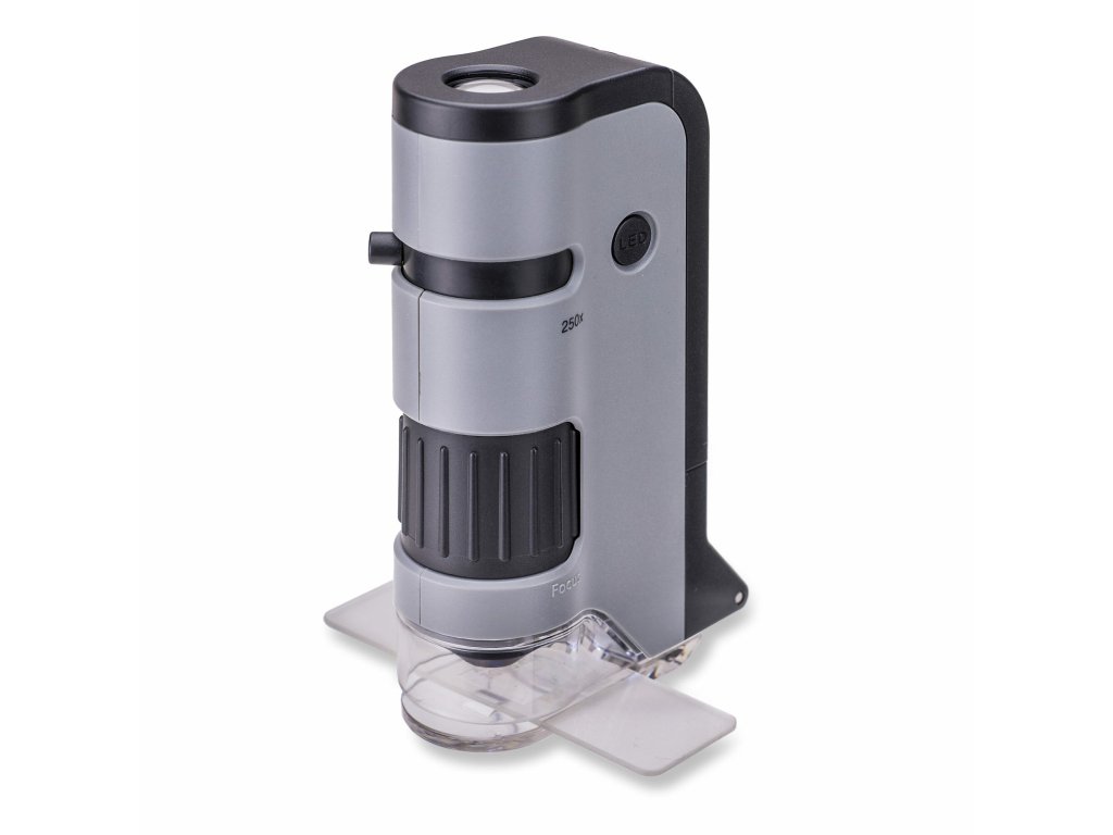 Vreckový mikroskop Carson MP-250 MicroFlip s adaptérom na smartfón, so zabudovaným LED a UV osvetlením, so zväčšením 100x-250x a odklápacou základňou.