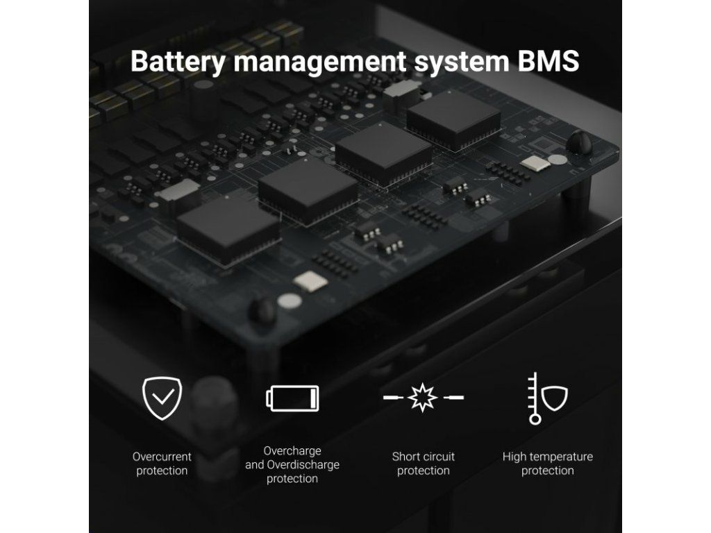 Batérie sú vybavené systémom BMS, ktorý monitoruje nielen nabitie a vybitie batérie, ale aj teplotu, čím zaisťuje bezpečnosť prevádzky a maximalizuje životnosť batérie. Sada obsahuje nabíjačku 14,6 8A.