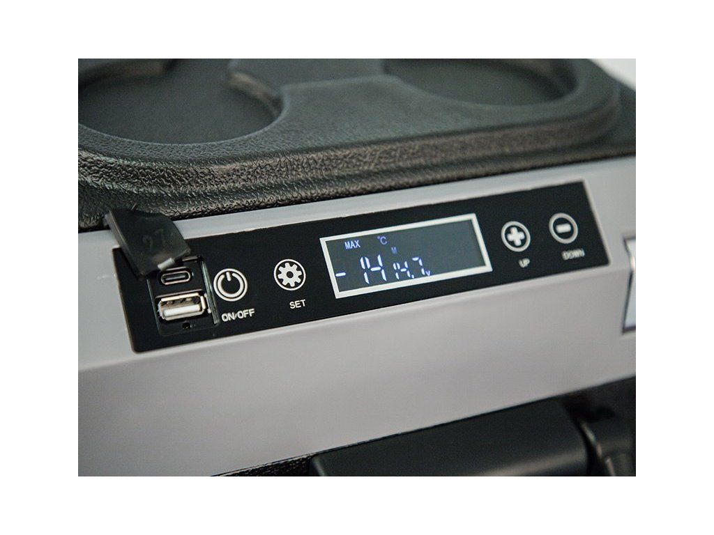 Zabudovaný USB a USB-C port umožňuje dobíjení mobilních zařízení i během chlazení – ideální pro moderní cestovatele, kteří chtějí být stále online.