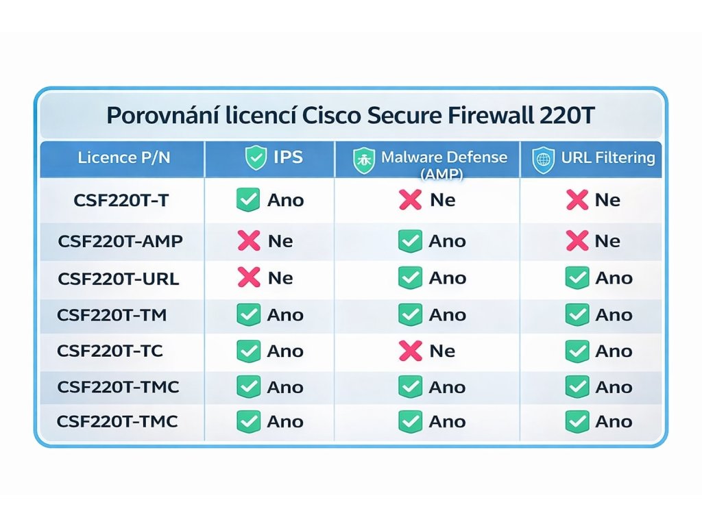 L-CSF220-TMC-1Y Popis produktu *Produkt: Kompletní bezpečnostní licence Threat, Malware a URL Filtering pro Cisco Secure Firewall 220 s Threat Defense softwarem *Určení: Aktivace všech hlavních bezpečnostních funkcí NGFW včetně IPS, ochrany proti malwaru a filtrování webového provozu *Doba platnosti: Licence je platná po dobu 1 roku Funkce licence *IPS (Intrusion Prevention): Ano *Malware Defense (AMP): Ano *URL Filtering: Ano *Typ licence: Threat + Malware + URL (TMC) *Software: Cisco Firepower Threat Defense (FTD) Licenční model *Typ: Časově omezená licence (subscription) *Délka licence: 1 rok *Doručení: Smart Licensing / elektronická licence Omezení a poznámky *Vazba na zařízení: Licence je vázána na konkrétní zařízení *Požadavek: Vyžaduje provoz firewallu v režimu Threat Defense (FTD) *Základ: Threat (IPS) je součástí této licence Kompatibilita *Podporované modely: Cisco Secure Firewall 220 Series Objednací informace *Part number: L-CSF220-TMC-1Y Web výrobce: https://www.cisco.com/c/en/us/products/collateral/security/secure-firewall/guide-c07-737902.htmlDodatočné parametre
