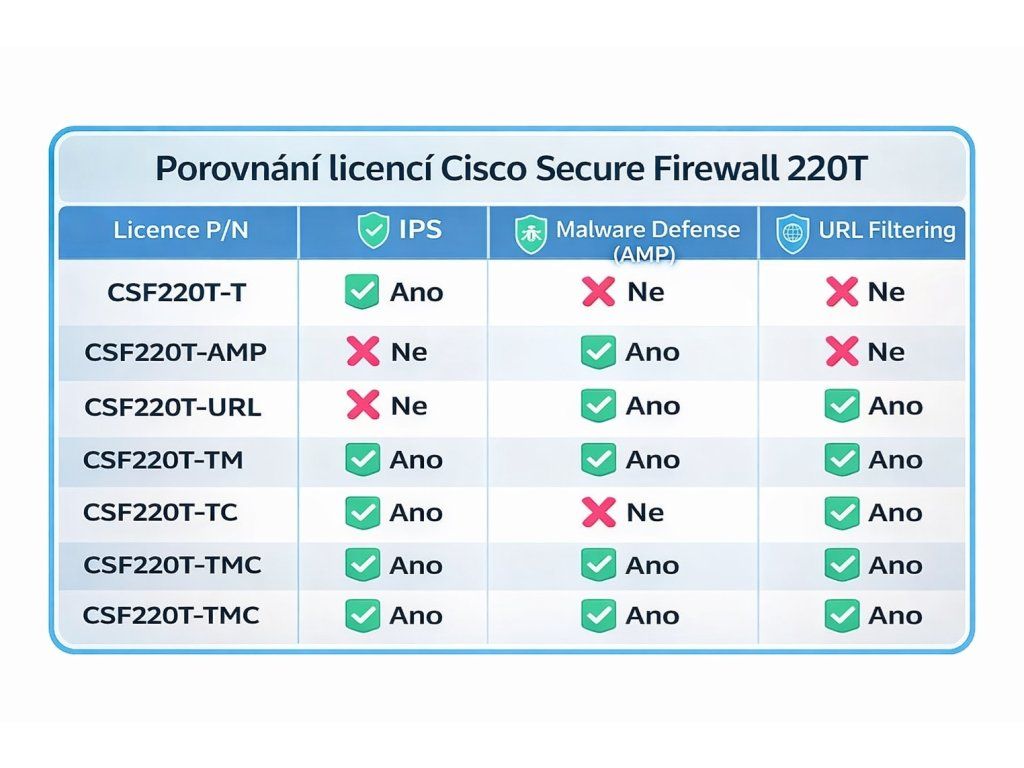 L-CSF220T-TM-3Y Popis produktu *Produkt: Bezpečnostní licence Threat a Malware pro Cisco Secure Firewall 220 s Threat Defense softwarem *Určení: Aktivace IPS ochrany a ochrany proti malwaru pro pokročilé zabezpečení síťového provozu *Doba platnosti: Licence je platná po dobu 3 let Funkce licence *IPS (Intrusion Prevention): Ano *Malware Defense (AMP): Ano *URL Filtering: Ne *Typ licence: Threat + Malware (TM) *Software: Cisco Firepower Threat Defense (FTD) Licenční model *Typ: Časově omezená licence (subscription) *Délka licence: 3 roky *Doručení: Smart Licensing / elektronická licence Omezení a poznámky *Vazba na zařízení: Licence je vázána na konkrétní zařízení *Požadavek: Vyžaduje provoz firewallu v režimu Threat Defense (FTD) *Základ: Threat (IPS) je součástí této licence Kompatibilita *Podporované modely: Cisco Secure Firewall 220 Series Objednací informace *Part number: L-CSF220T-TM-3Y Web výrobce: https://www.cisco.com/c/en/us/products/collateral/security/secure-firewall/guide-c07-737902.htmlDodatočné parametre