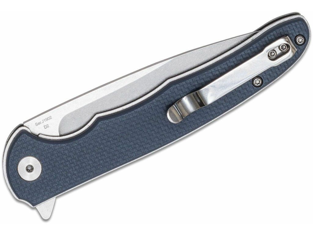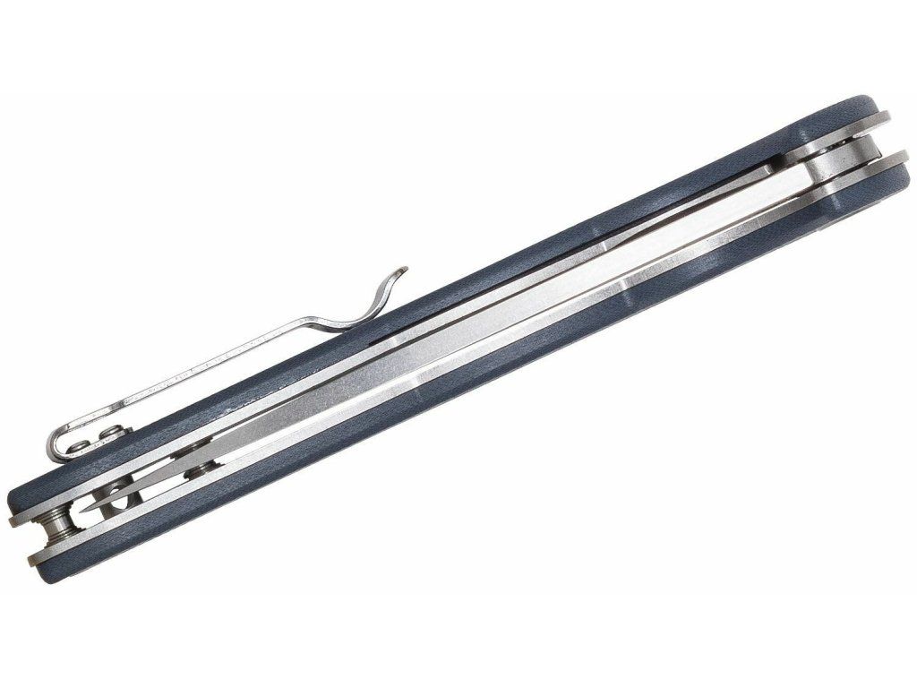 Rukoväť je z materiálu G10 šedo-modrej farby, so sponou na vrecká.