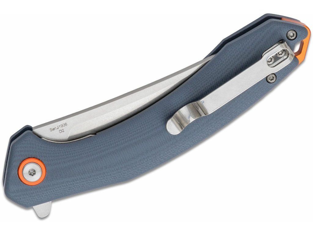 Rukoväť je z odolného materiálu G10 modro-šedej farby a je tvarovaná pomocou CNC, s dierkou na šnúrku a sponou na vrecká.