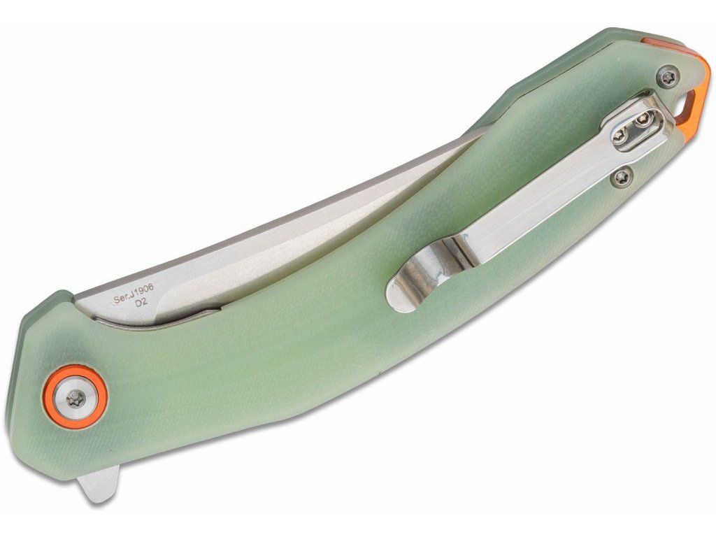 Rukoväť je z odolného materiálu G10 transparentnej zelenej farby a je tvarovaná pomocou CNC, s dierkou na šnúrku a sponou na vrecká.