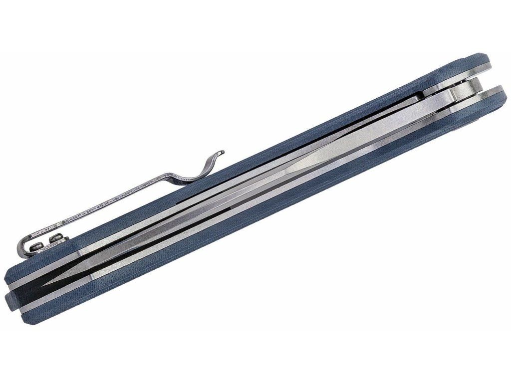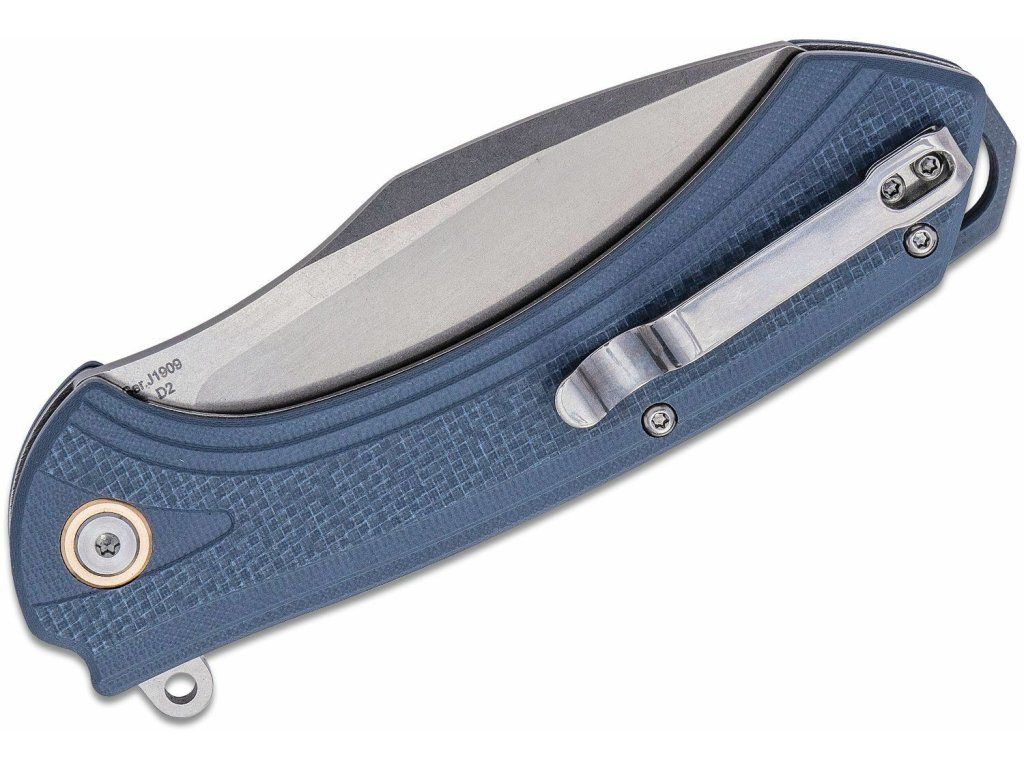 Rukoväť je z odolného materiálu G10 šedo-modrej farby, s nekĺzavým povrchom pre pohodlné uchopenie. S otvorom na šnúrku a sponou na vrecká.