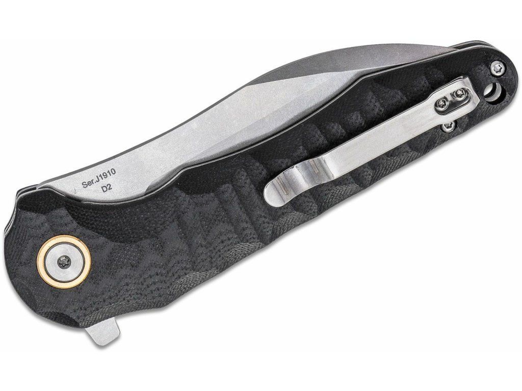 Rukoväť je z odolného materiálu G10 čiernej farby s výraznou textúrou vytvorenou pomocou CNC, s dierkou na šnúrku a sponou na vrecká.