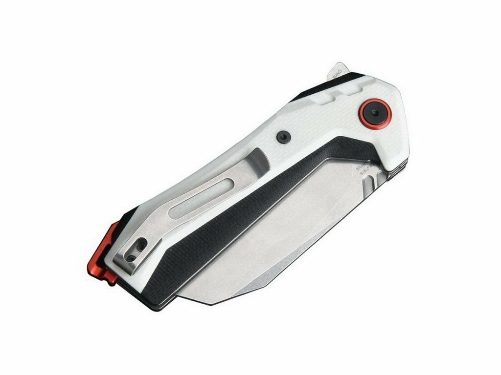 Rukoväť je z odolného materiálu G10 čierno-bielej farby s červenými prvkami, so sponou na vrecká.