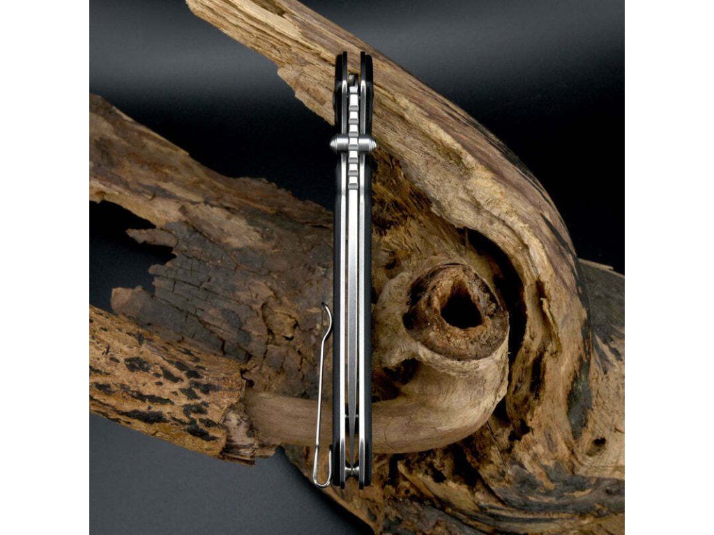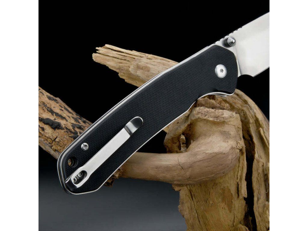 Rukoväť je z odolného materiálu G10 čiernej farby s textúrou pre pohodlné uchopenie, s dierkou na šnúrku a sponou na vrecká.