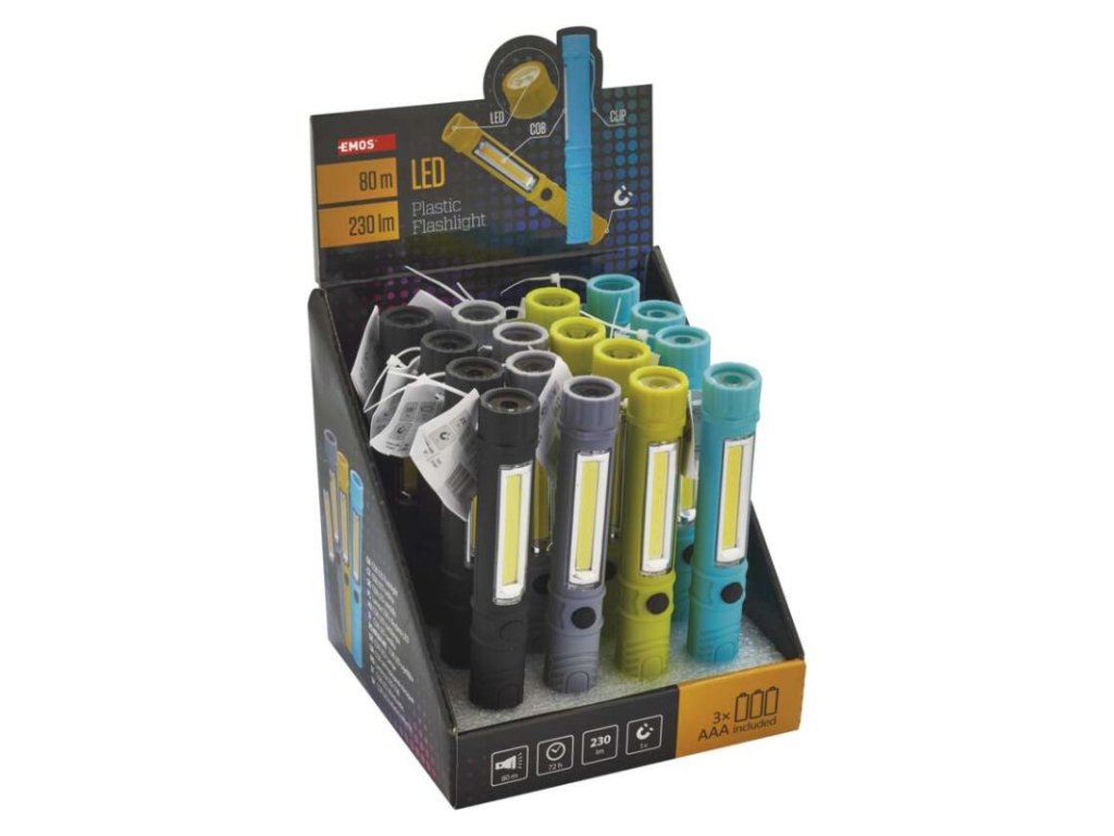 batérie súčasťou balenia: áno|doba nabíjania: neuvádza sa|doba svietenia: 47–72 h|doba svietenia detail: COB LED – 47 h, 1 LED – 72 h|dosvit: COB LED 100 % – 20 m, LED 100 % – 80 m|farba: mix farieb|fokus: nie|hmotnosť: 64 g|LED indikácia nabíjania: neuvádza sa|LED indikácia stavu akumulátora: neuvádza sa|materiál: ABS plast|maximálny dosvit: 80 m|maximálny svetelný tok: 230 lm|nabíjací: nie|napájanie: 3× AAA|nárazuvzdornosť: áno|počet režimov svietenia: 2|predajný obal: 16 ks, display box|príslušenstvo: neuvádza sa|režimy: LED 100 %, COB LED 100 %|rozmer: 168 × 29 × 26 mm|špeciálna funkcia: neuvádza sa|svetelný tok: COB LED 100 % – 230 lm|typ batérie: LR03 (1,5 V)|typ napájacieho konektoru: neuvádza sa|vodeodolná: nie|vybavenie: klip|záručná doba: 2 roky|zdroj svetla: COB LED + LED|značka: EMOSDodatočné parametre