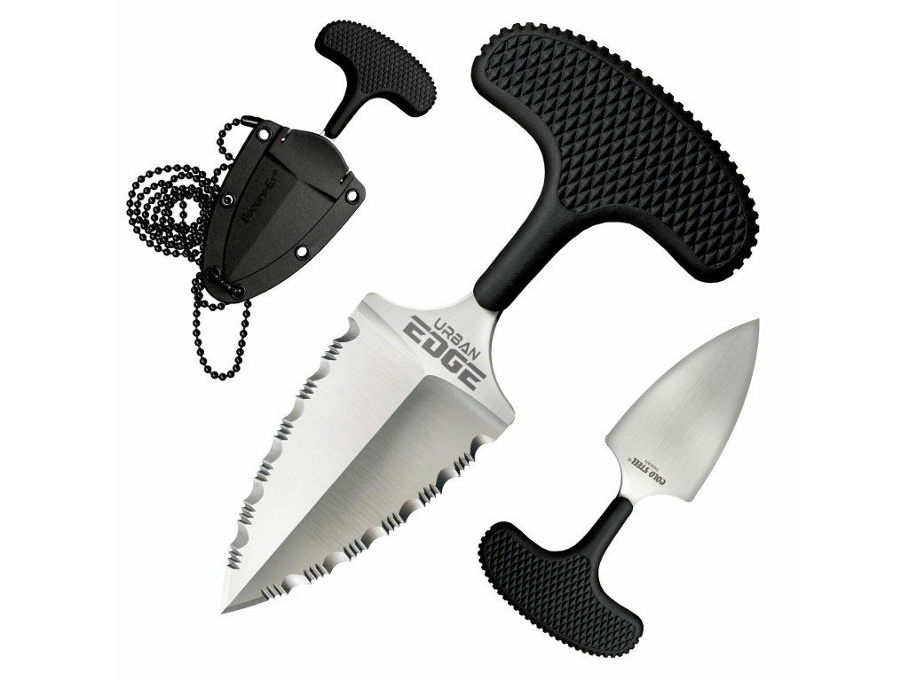 Ľahká tlačná dýka Cold Steel Urba Edge Serrated vhodná na každodenné (EDC) nosenie do mesta, ale aj na skryté nosenie alebo zavesené okolo krku. Možno ju využiť aj na rezanie rôznych materiálov ako laná, drôty, gumové tesnenia a pod.