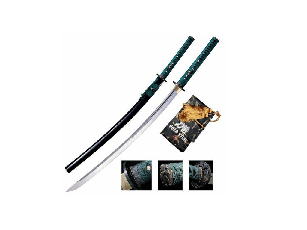 Rukoväť z tvrdého dreva je pevne obalená tyrkysovou hodvábnou šnúrou a obsahuje tradičnú podložku Menuki a Samé (Ray Skin).