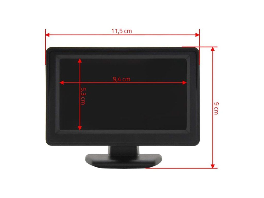 Displej možno ľahko upevniť na vhodné miesto pomocou lepiacej vrstvy na spodnej strane stojana. Vonkajšie rozmery displeja so stojanom sú 11,5 cm x 9 cm. Samotný 4,3" displej má rozmery 9,4 x 5,3 cm. Pozorovací uhol displeja možno nastaviť pomocou stojana.