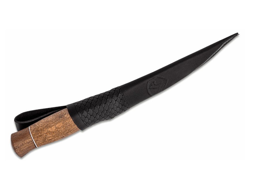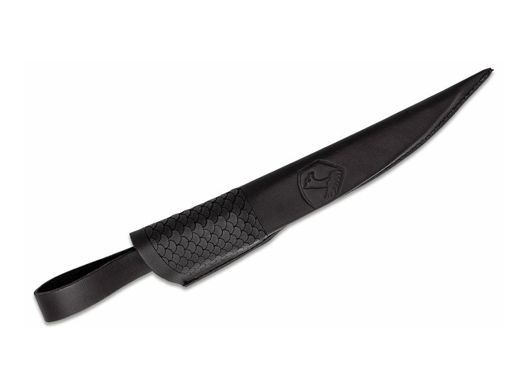 K nožu sa dodáva ručne vyrobené čierne kožené puzdro zdobené vzorom rybích šupín.
